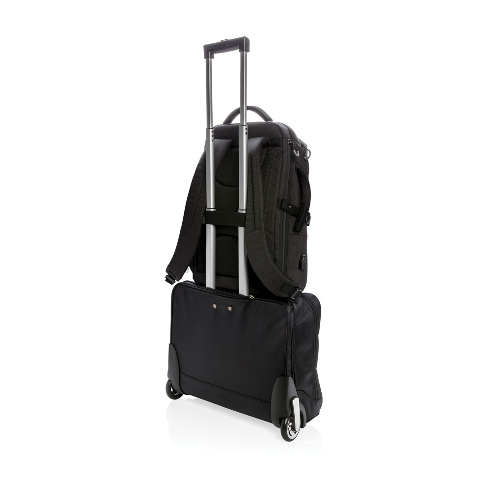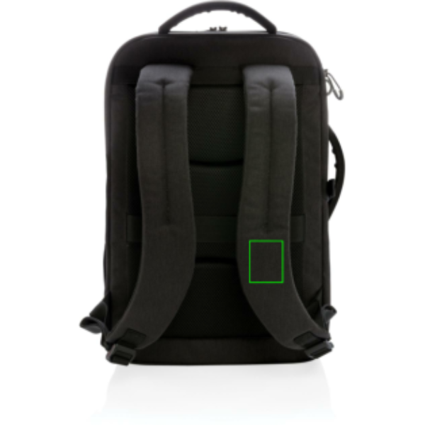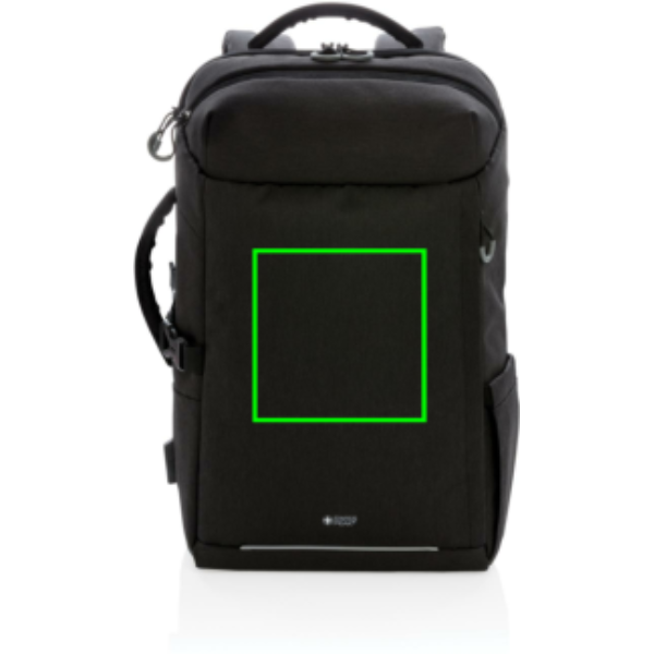 This carry-on travel backpack is intended for overnight or weekend trips. It is designed with a padded 17" laptop compartment to protect your device. This style has the capacity of a trolley without the weight of the wheels and handle, plus using a backpack makes you more mobile, hands-free and simplifies your travel experience. Leave your wheels at home and travel easily. Including trolley strap, water bottle side pocket and USB A output. Top quick access pocket, front zippered pocket and RFID protected pockets. With AWARE™ tracer that validates the genuine use of recycled materials. Each bag has reused 35.5 0.5L PET bottles. 2% of proceeds of each Impact product sold will be donated to Water.org. PVC free.