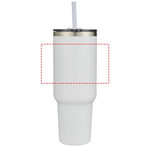 RCS certified double walled copper vacuum insulated tumbler, constructed using 91% post-consumer recycled stainless steel that will keep drinks cold for at least 24 hours, or hot for 9 hours. Features a Tritan straw, and a lid slider function to prevent spills. The 100% recycled plastic press-on swivel lid securely holds the straw in place, and can easily be rotated to expose the drink opening. Durable exterior powder coating. Volume capacity: 1200 ml. Hand wash only.
