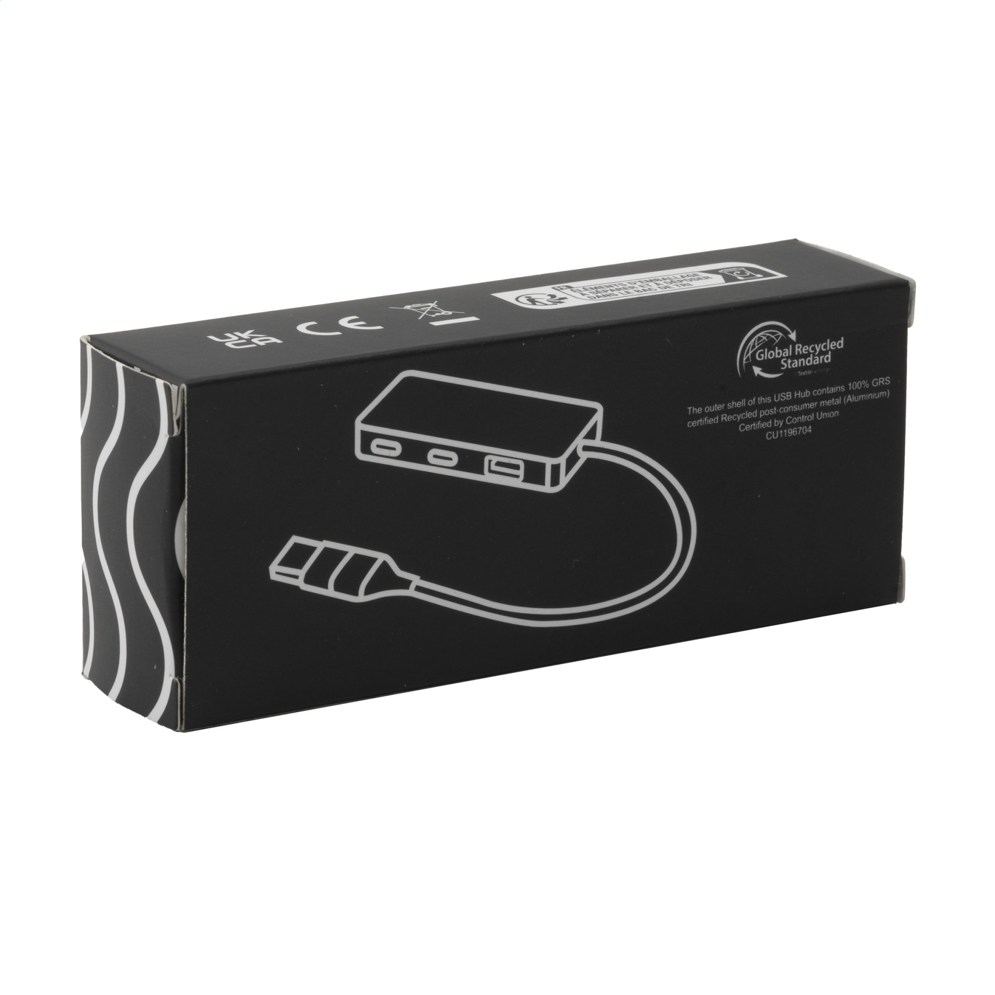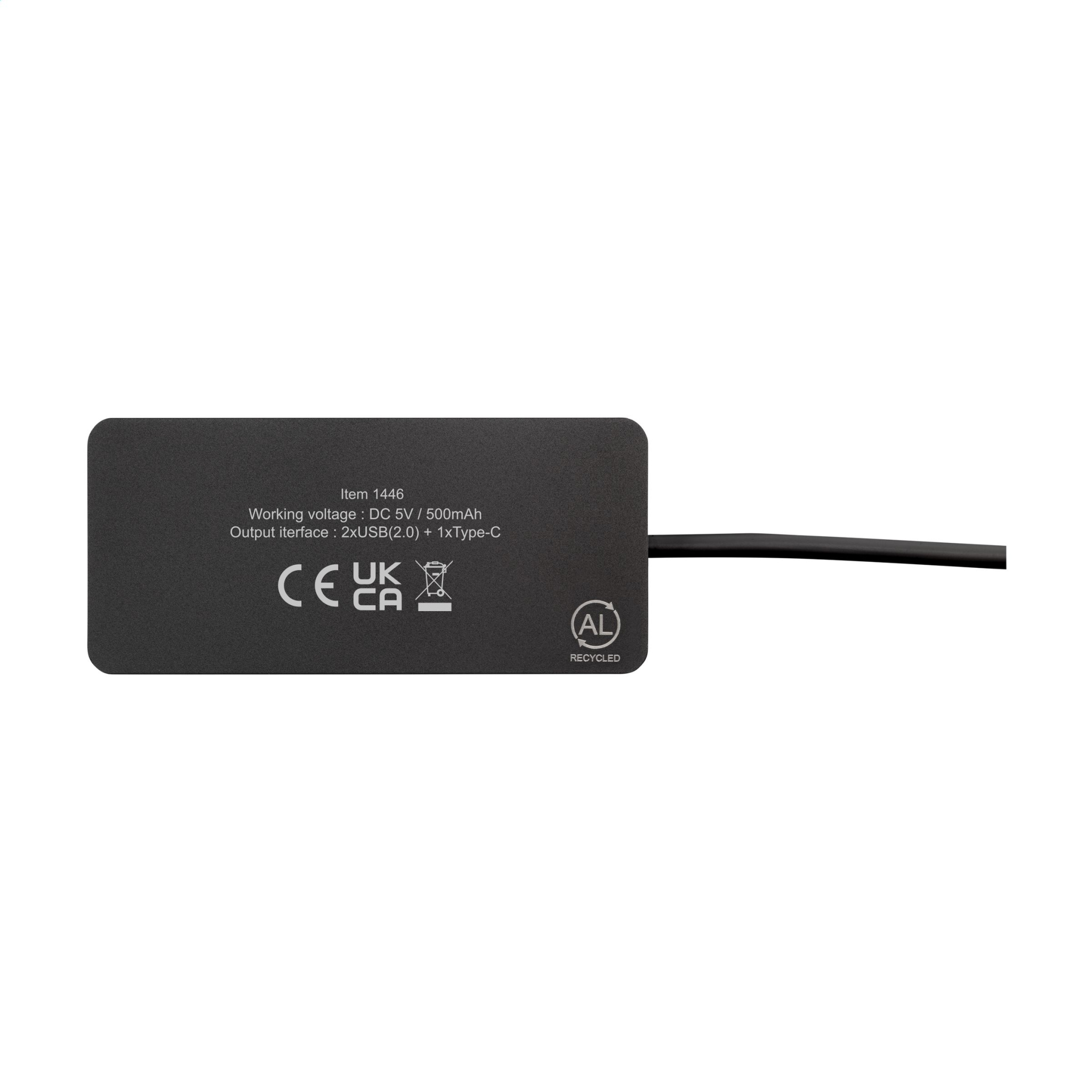 Compact, lightweight 2.0 USB hub. The casing is made from 100% GRS-certified recycled aluminium. Equipped with 3 USB ports: 1 USB-A 2.0 port and 2 Type-C ports for connecting additional devices. Supplied with matching black cable with a dual input connector, suitable for both type-c and USB-A computers. Total recycled material: 50%. By using recycled aluminium, fewer new raw materials are used during the production of this product. This means less energy consumption and less use of water. A responsible choice. Each item is individually boxed.