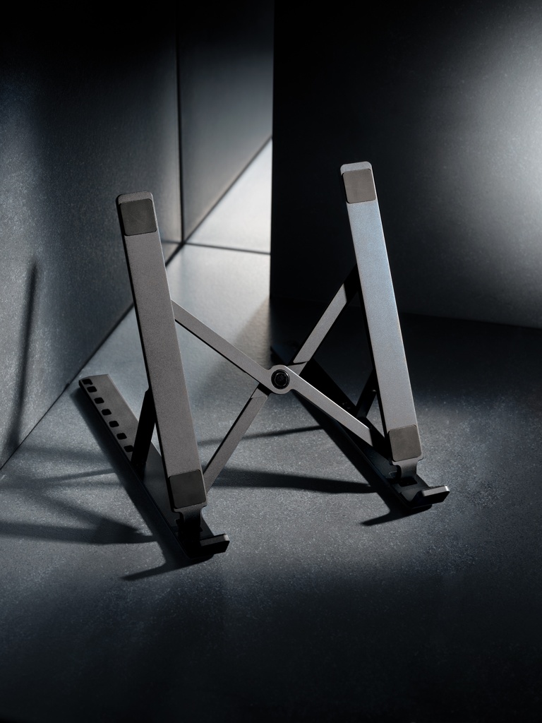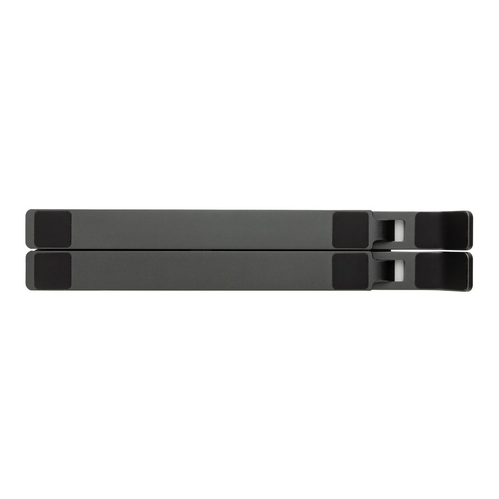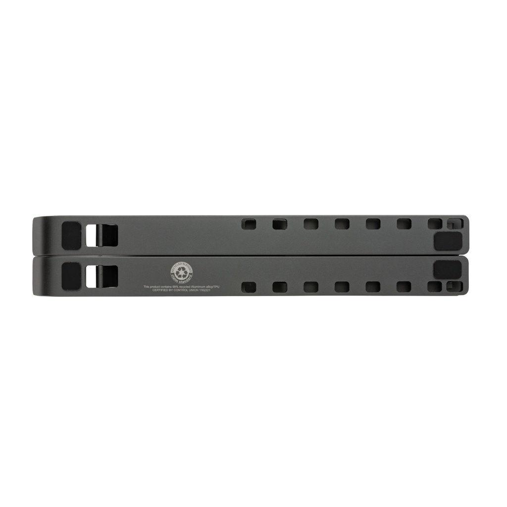 Aluminium laptop stand made with RCS (Recycled Claim Standard) certified recycled aluminium and TPU. Total recycled content: 99% based on total item weight. RCS certification ensures a completely certified supply chain of the recycled materials. The stand is foldable and can hold any laptop up to 15.6”. The stand can be adjusted to 8 different angles for optimal ergonomic posture when working on your laptop. Aluminium does not lose its characteristics in the recycling process and can be recycled endlessly. Compatible with most common tablets and laptops. With RCS certified recycled TPU strips at the bottom to avoid slipping. Packed in FSC® mix packaging.