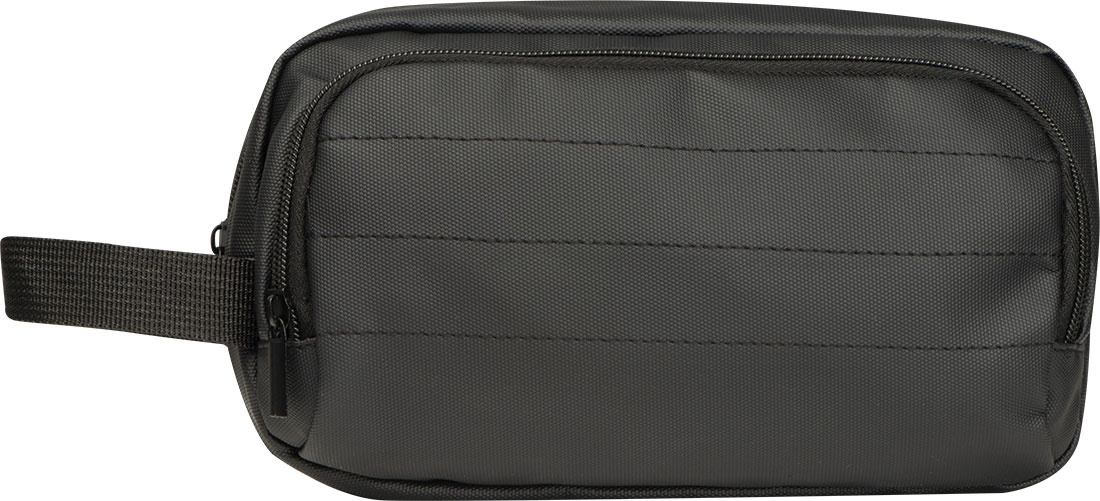 High-quality padded toiletry bag made of polyester with PU coating. It features a main zippered compartment and an additional front zip pocket, as well as a carrying loop. Durable and water-resistant, perfect for travel and daily use.
