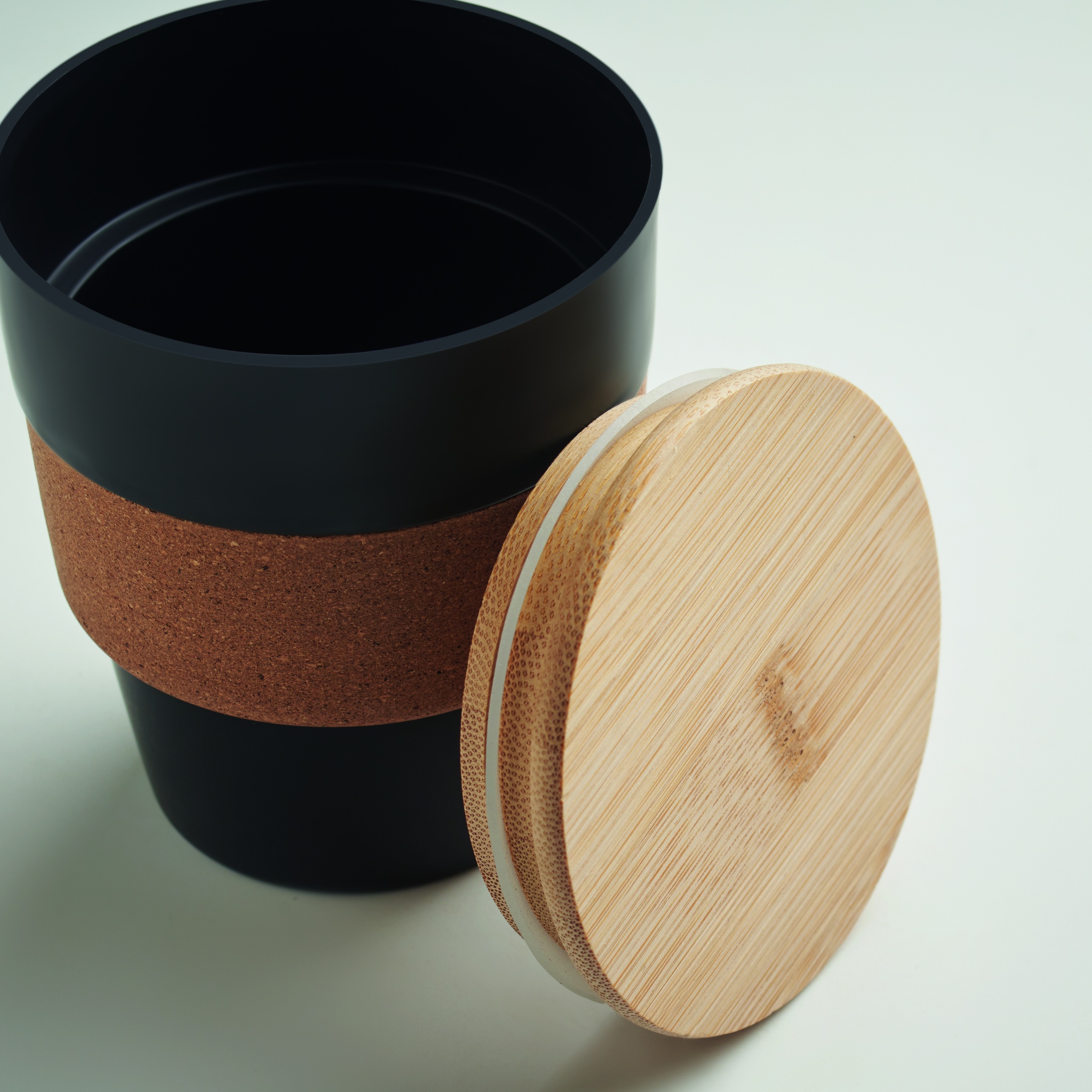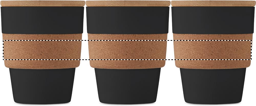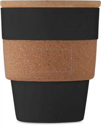 Single wall tumbler in recycled PP with cork protective sleeve and bamboo lid. Capacity: 300 ml. As this is a single walled mug heat transfer can still occur. Bamboo is a natural product, there may be slight variations in colour and size per item, which can affect the final decoration outcome.