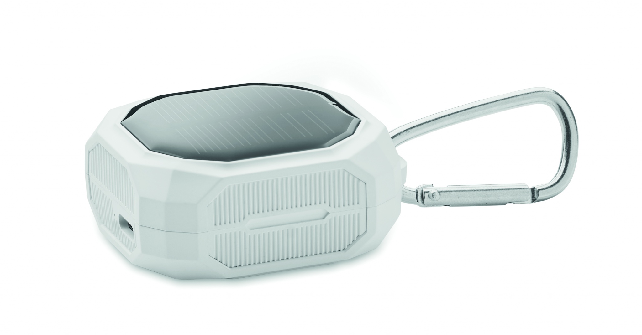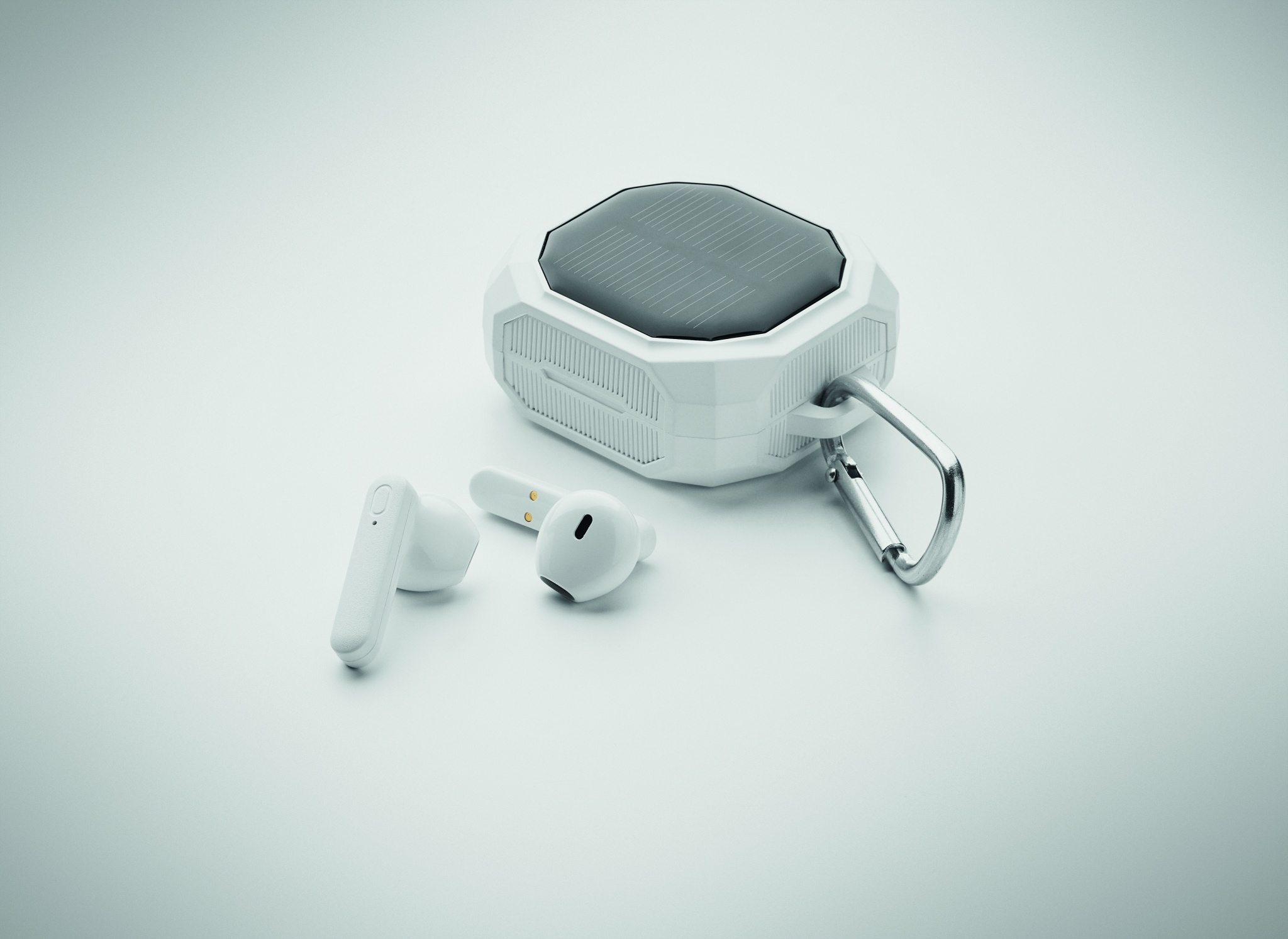ABS True Wireless Stereo (TWS) 5.3 wireless earbuds with microphone and carabiner. 30 mAh battery. Playing time approx. 4 hours. It has a solar charging battery. Auto-pairing. Including a Type C charging cable and a 200 mAh charging station.