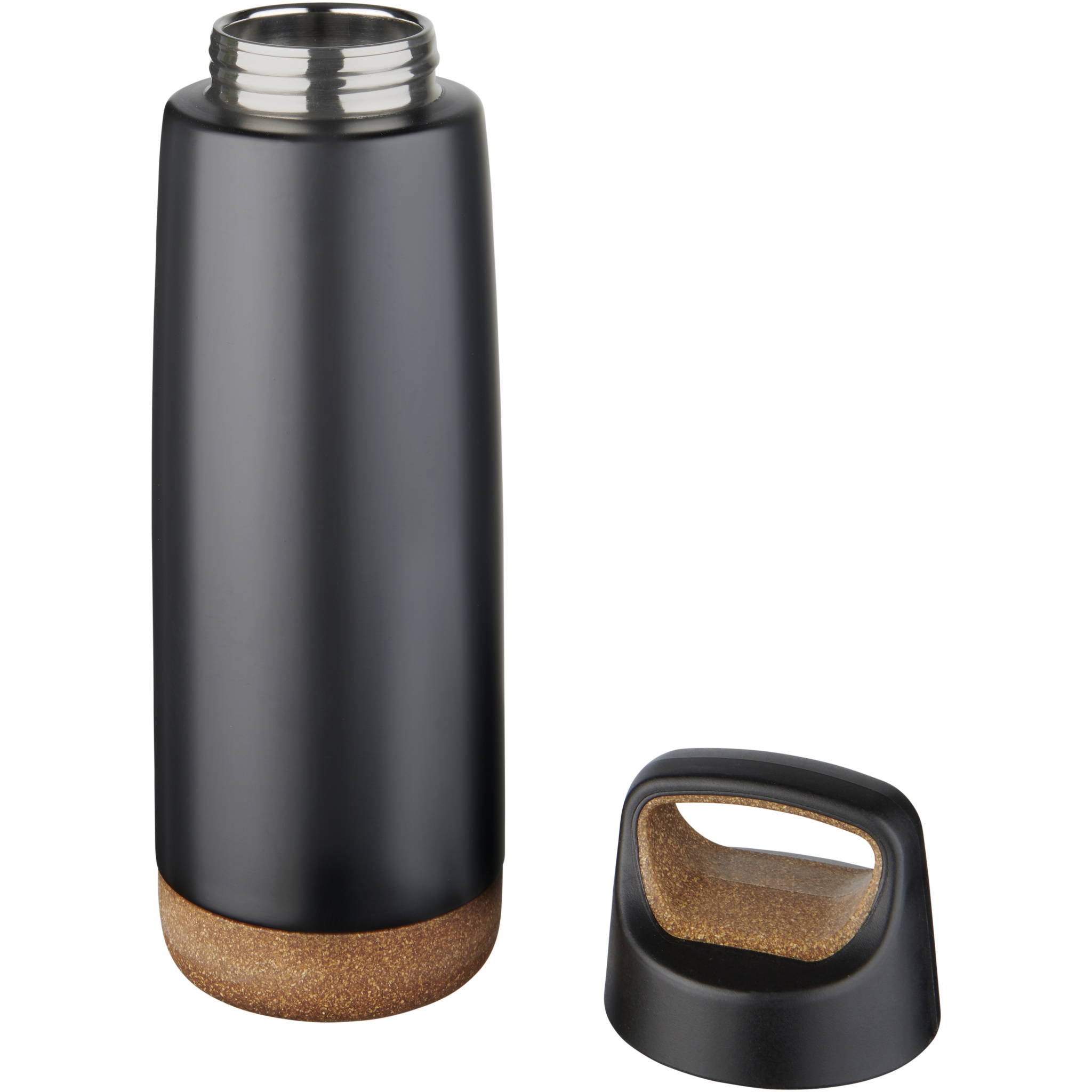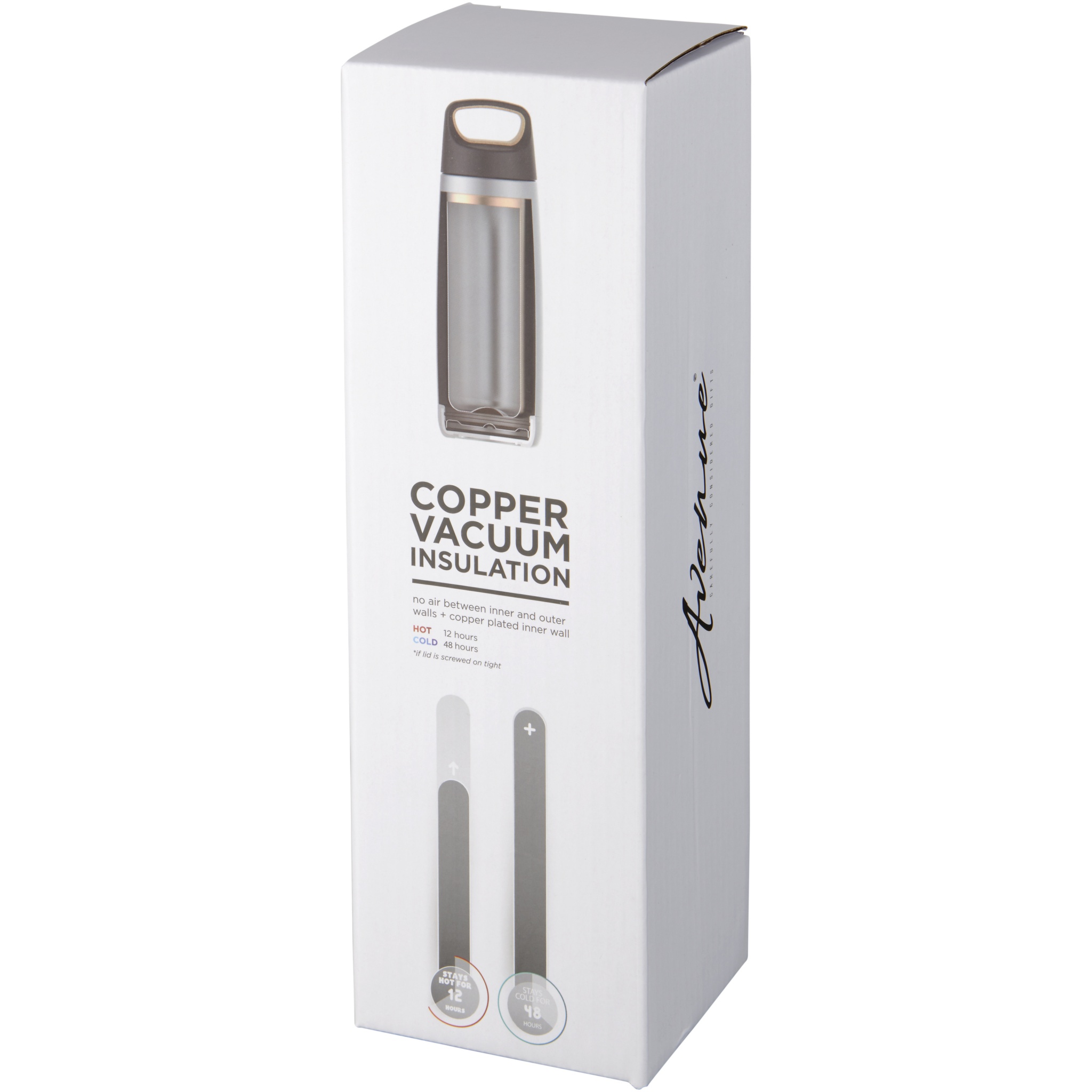 Double-wall stainless steel vacuum construction with copper insulation, which allows beverages to stay cold for 48 hours or hot for at least 12 hours. The construction also prevents condensation on the outside of the bottle. Screw-on lid with cork design details as well as a skid-proof bottom. Volume capacity is 600ml. Presented in an Avenue gift box.