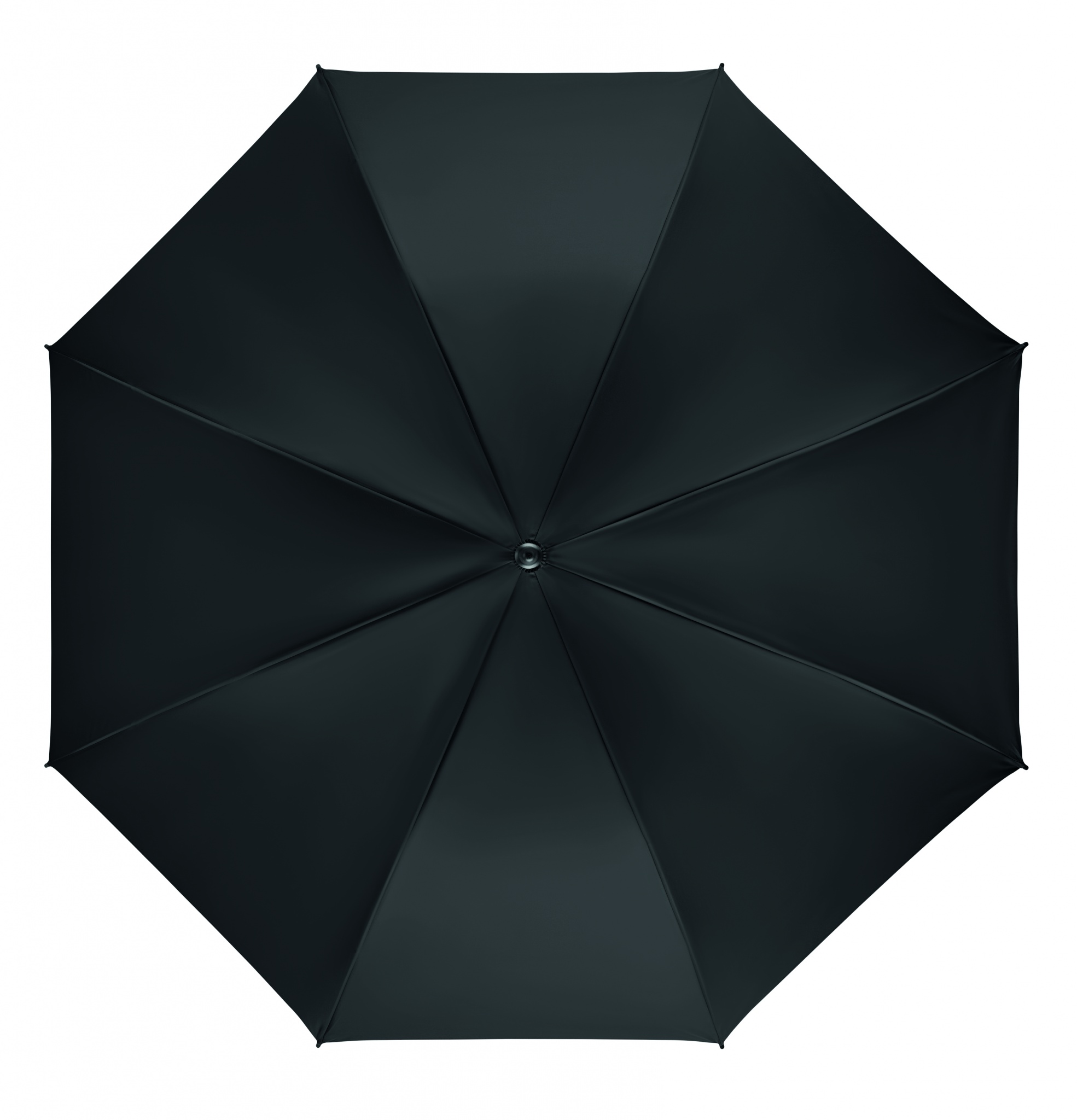 27 inch auto open windproof umbrella in 190T pongee with fiberglass shaft and ribs. Black plastic tips and top. Straight black ABS handle with rubberish finish. Manual closure.