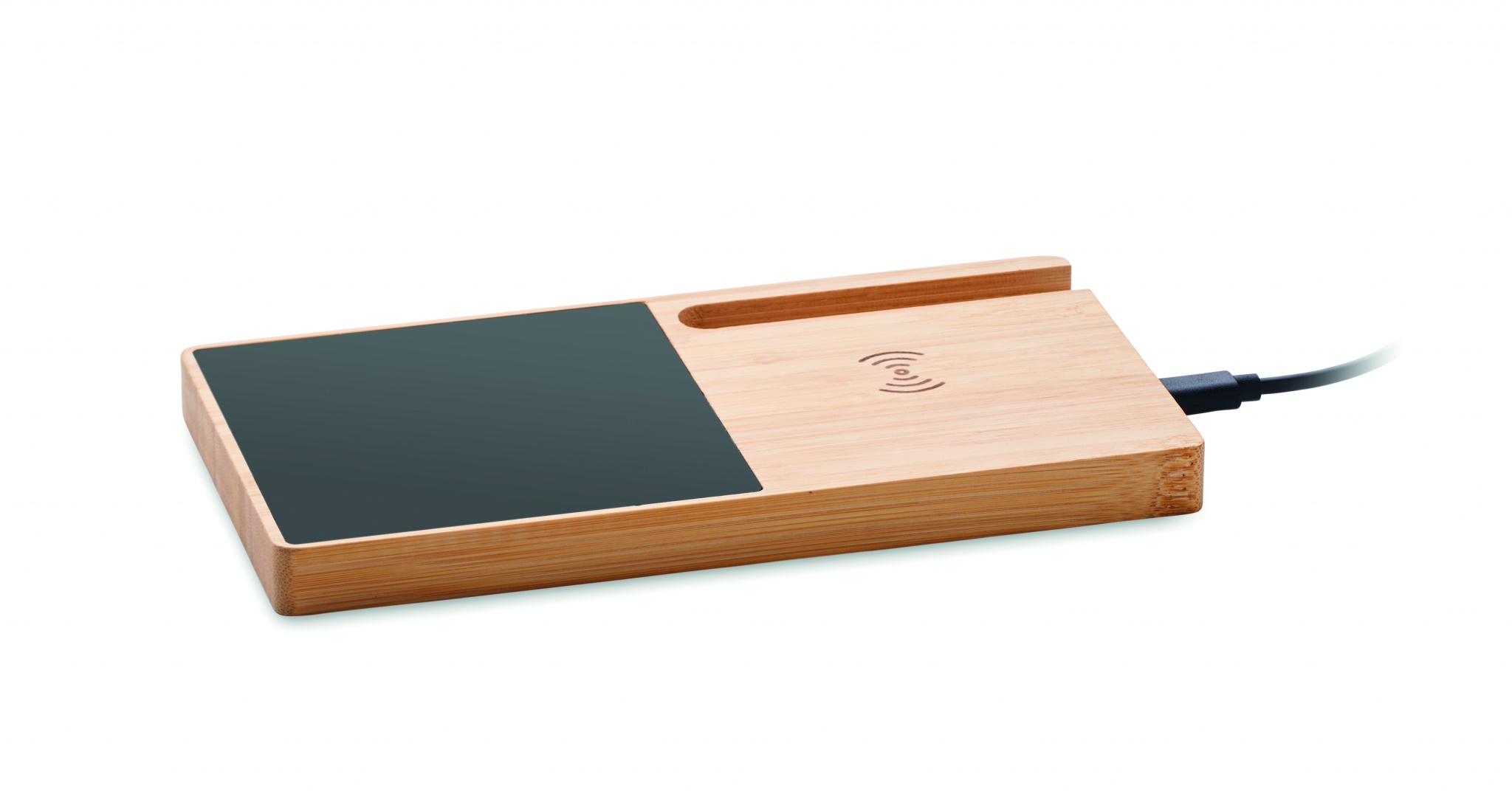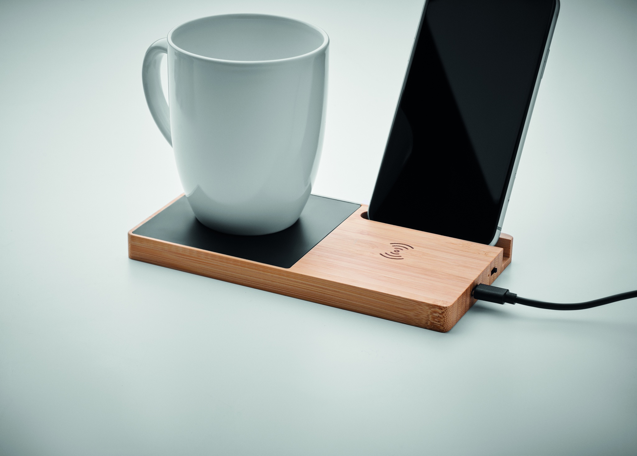 Bambusest juhtmevaba laadija koos kruusisoojendaja ja telefonialusega. Ühendage seade arvutiga, asetage nutitelefon sellele ja laske sellel laadida. Väljund: DC 9V/1,67A (15W). Ühildub kõigi QI-toega seadmetega, nagu uusimad Androidid, iPhone® 8, X ja uuemad.