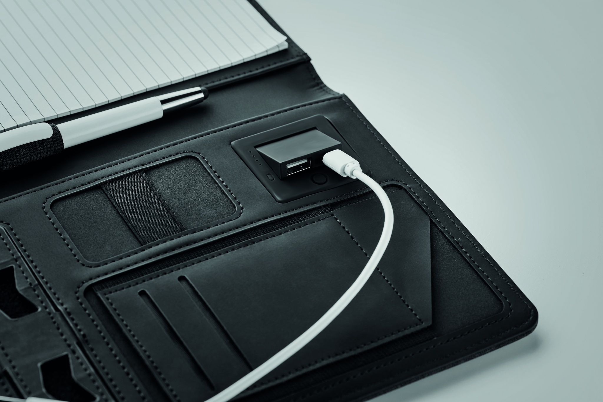 A5 konverentsimapp PU-nahast kaantega. Kaasas 4000 mAh akupank. Sisseehitatud mikro-USB C-tüüpi pistik,  20 joonelise lehega märkmi, mitu sisemist sektsiooni, magnetiline sulgur, elastne pliiatsihoidja.