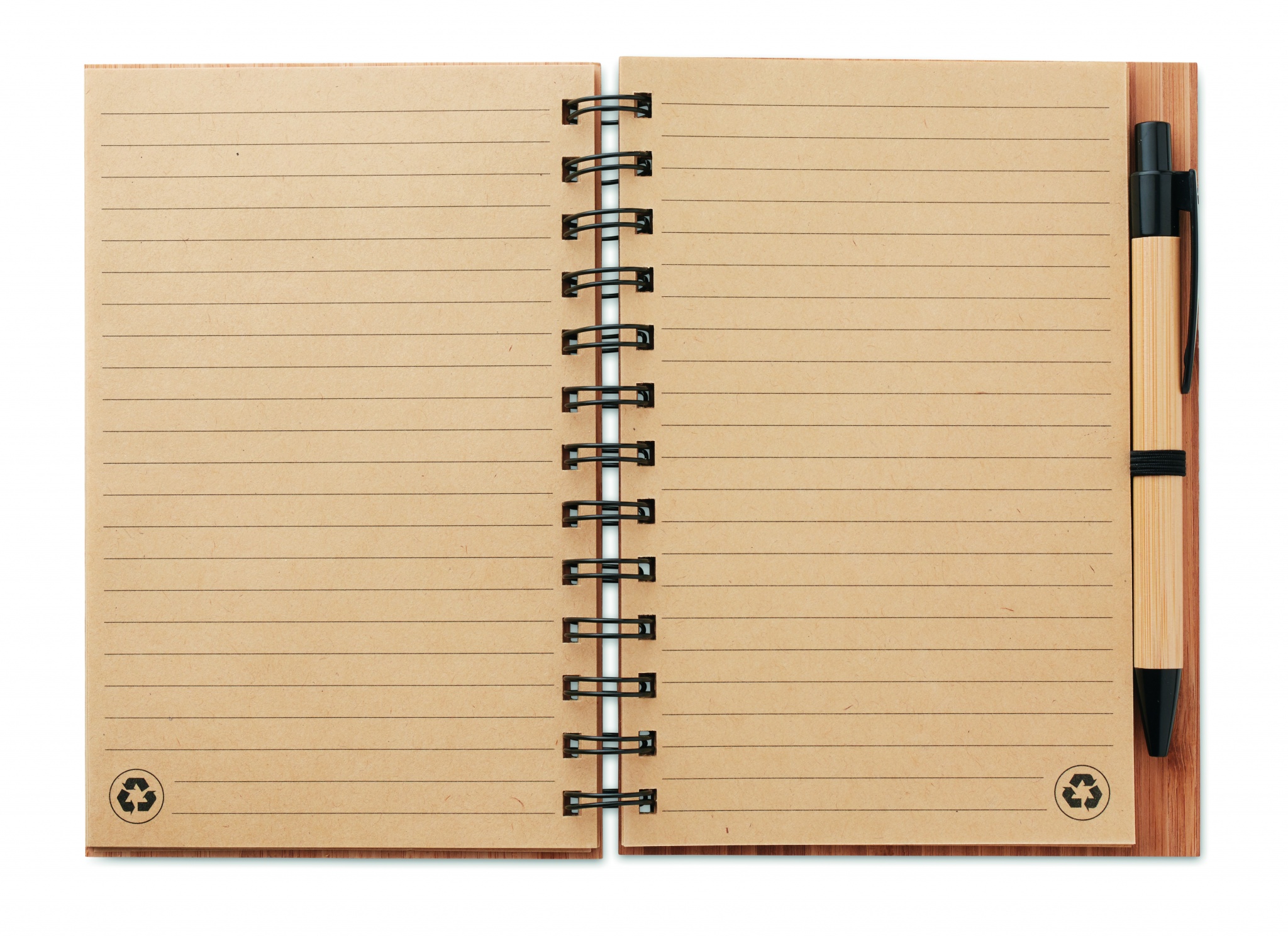 Bambusest kaanega märkmik koos sobiva pliiatsiga. Kahejuhtmeline. 140 joonega taaskasutatud paberilehte (70 lehte). Sobiv nupp-pastapliiats bambusest silindri ja ABS-detailidega. Elastne pliiatsihoidja. Bambus on looduslik toode, ühe eseme värvis ja suuruses võib esineda väikesi erinevusi, mis võivad mõjutada lõppviimistlust.