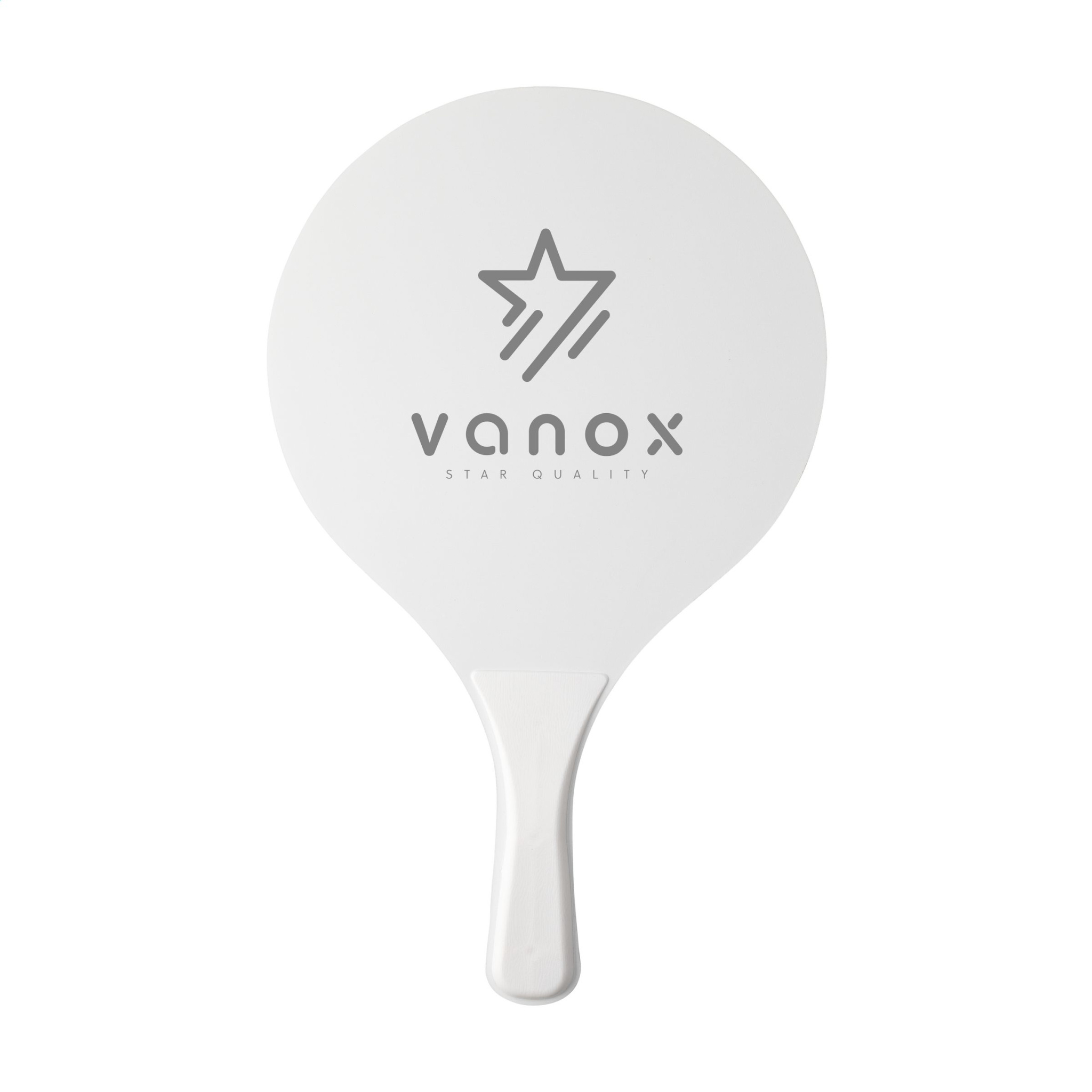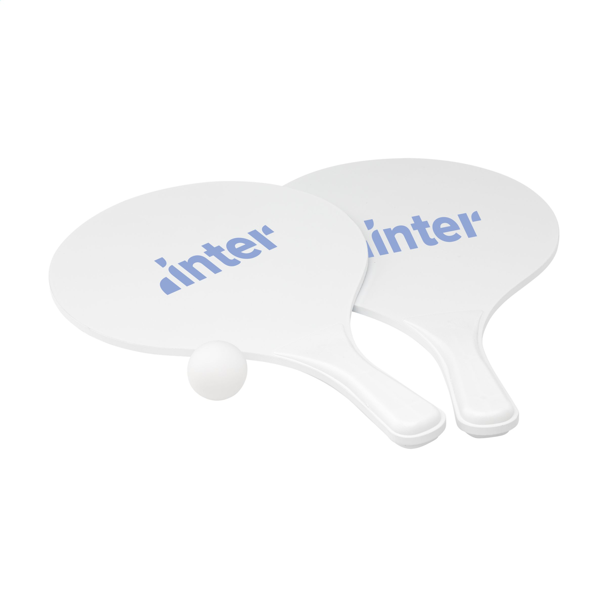 Sportlik rannakomplekt: 2 MDF-puidust reketit PP plastikust käepidemetega ja kummipalliga. Iga komplekt on võrgusilmaga hoiuvõrgus.