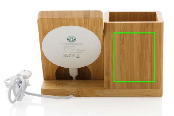 10 W juhtmevaba kiirlaadija koos pliiatsihoidjaga, mis on valmistatud RCS (Recycled Claim Standard) sertifitseeritud taaskasutatud ABS-ist. Kogu taaskasutatud sisaldus: 6% eseme kogukaalust (sh bambusest alus) Korraldaja bambusest välispind on täielikult valmistatud FSC 100 bambusest. Kaasa arvatud 120 cm C-tüüpi laadimiskaabel, mis on valmistatud RCS-sertifikaadiga taaskasutatud TPE-st. Pakitud FSC mix kraft karpi. Type-C sisend 5V/2A; 9V/1,67A. Juhtmeta väljund 5V/1A;9V/1.1A (10W) Registreeritud disain®