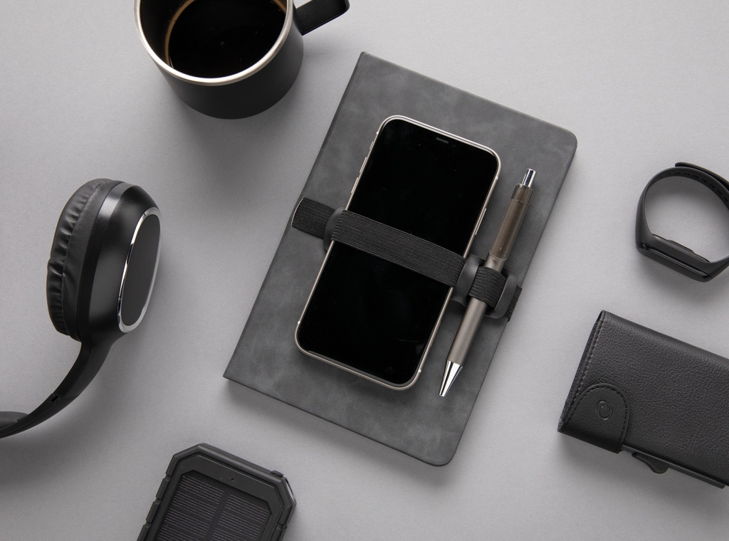 Tooted Elektroonika Deluxe kõvakaaneline PU-märkmik A5 telefoni ja pliiatsihoidjaga