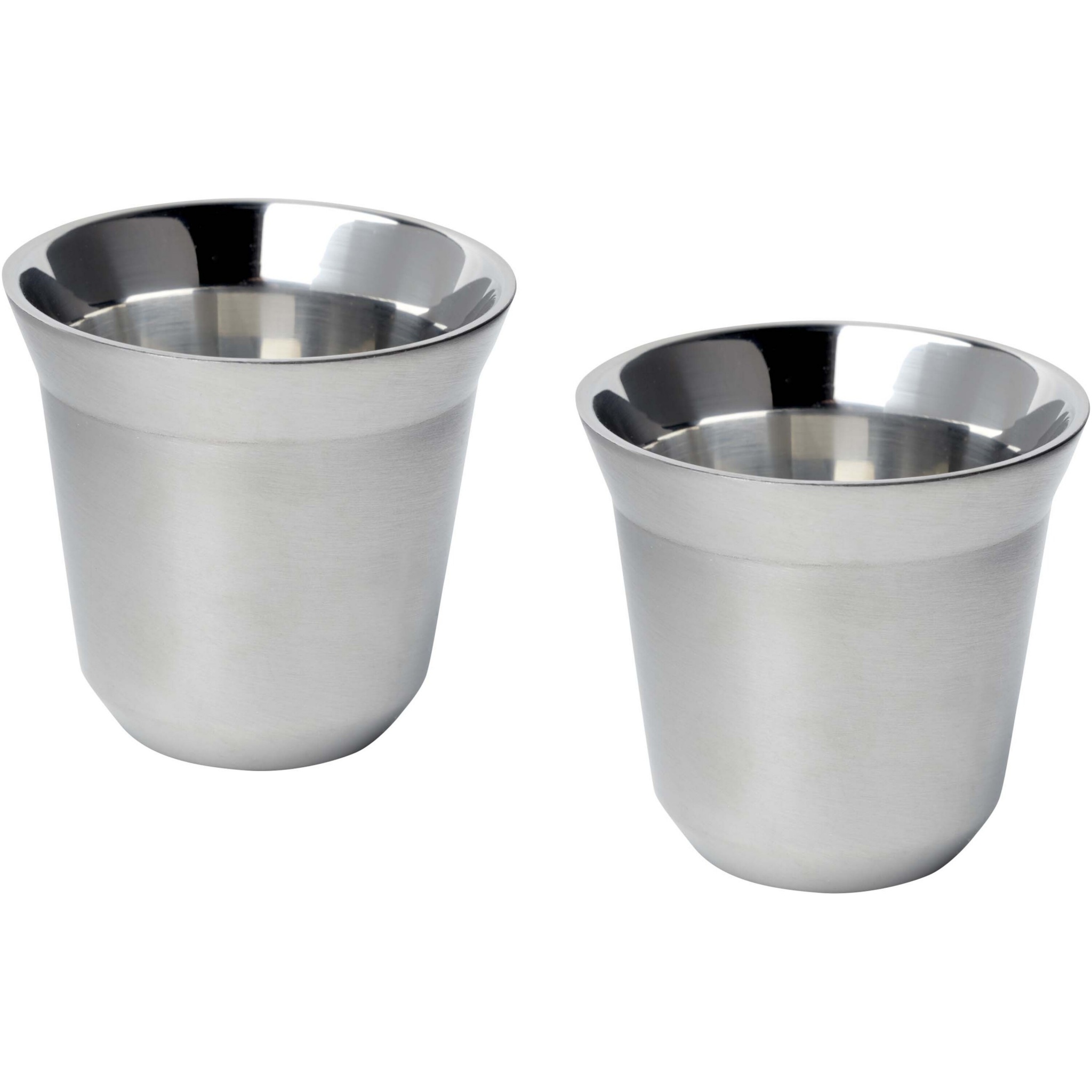2 kahekordse seinaga RCS-sertifikaadiga roostevabast terasest espressotassi komplekt. Maht 80 ml. Tarnitakse taaskasutatud papist kinkekarbis.