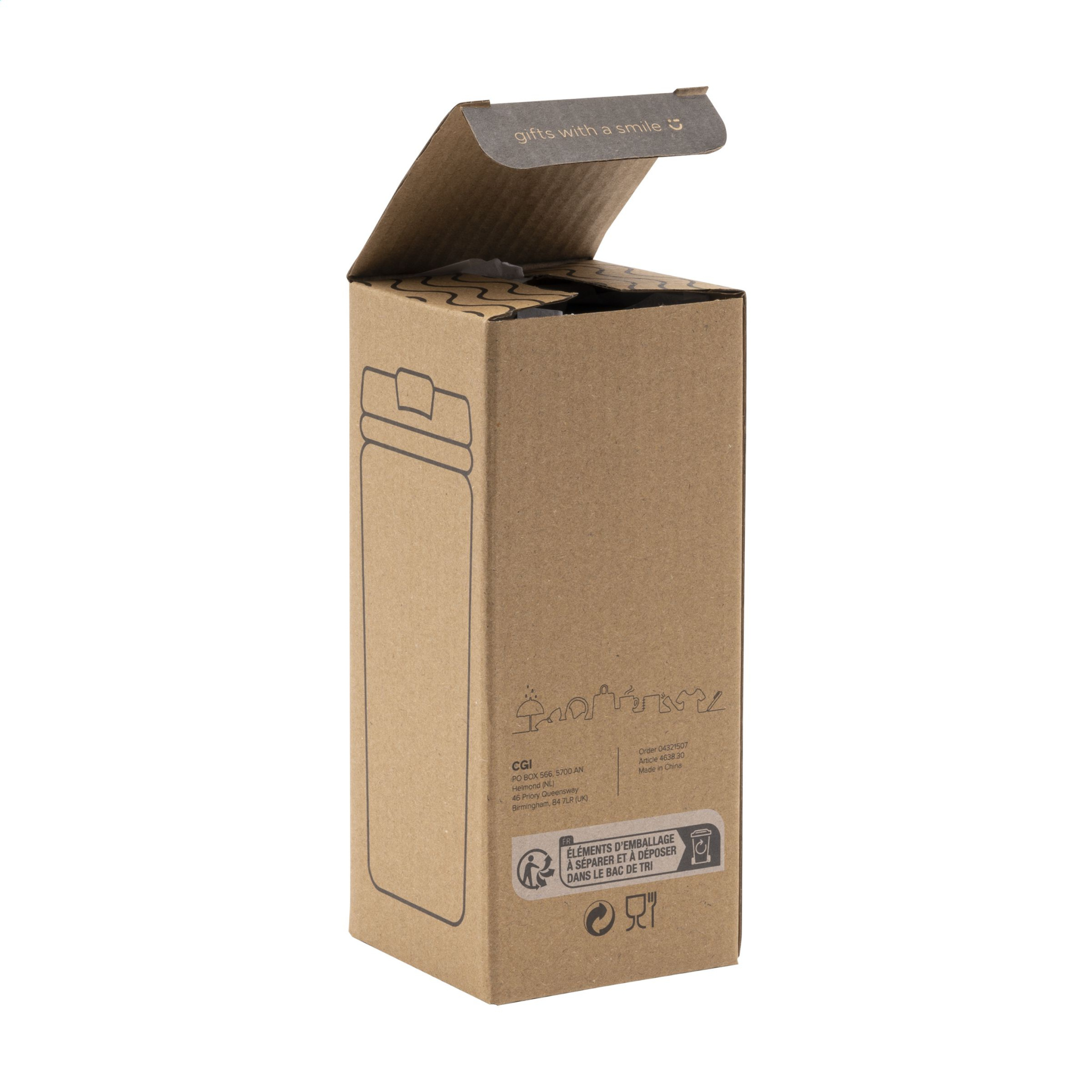 Topeltseinaline, lekkekindel roostevabast terasest termotass keeratava korgiga, klõpsava. PP sisesein. Hoidikul on iseloomulik 3D geomeetriline teemantmuster. Libisemiskindel alus. Mahutavus 300 ml. Iga ese on eraldi karbis.