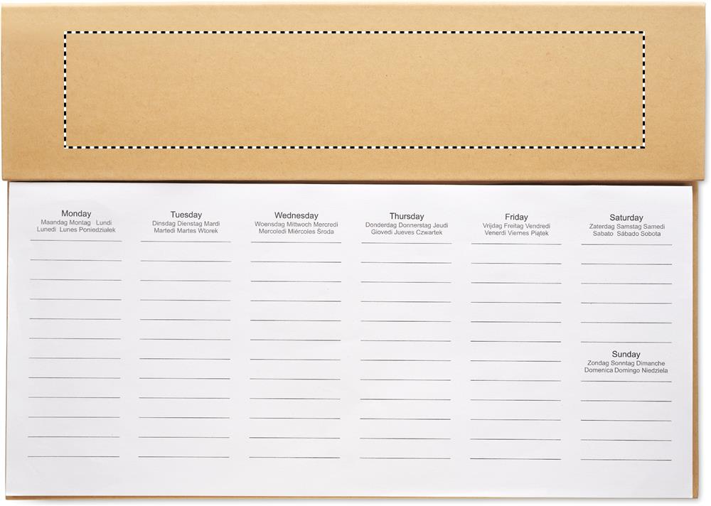 125-leheküljeline iganädalane lauaplaneerija 6 keeles (EN/DE/FR/ES/IT/NL/PL) jõupaberist kaanega, pappsilindri sinise tindiga nupuvajutusega pliiats, puidust joonlaud ja märkmeplokk.