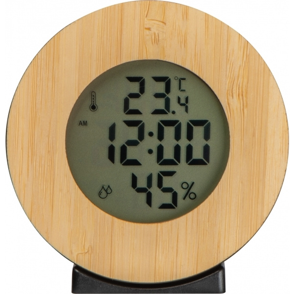 Digitaalne bambuselemendiga ilmajaam. Lisaks kellale (12h/24h) on sellel äratusfunktsioon, termomeeter (°C/°F), hügromeeter ja kuupäevanäit. Teie logo graveeritakse bambusrõngale. Ei sisalda ühte AAA patareid; palun tellige see eraldi (kauba nr 999400).