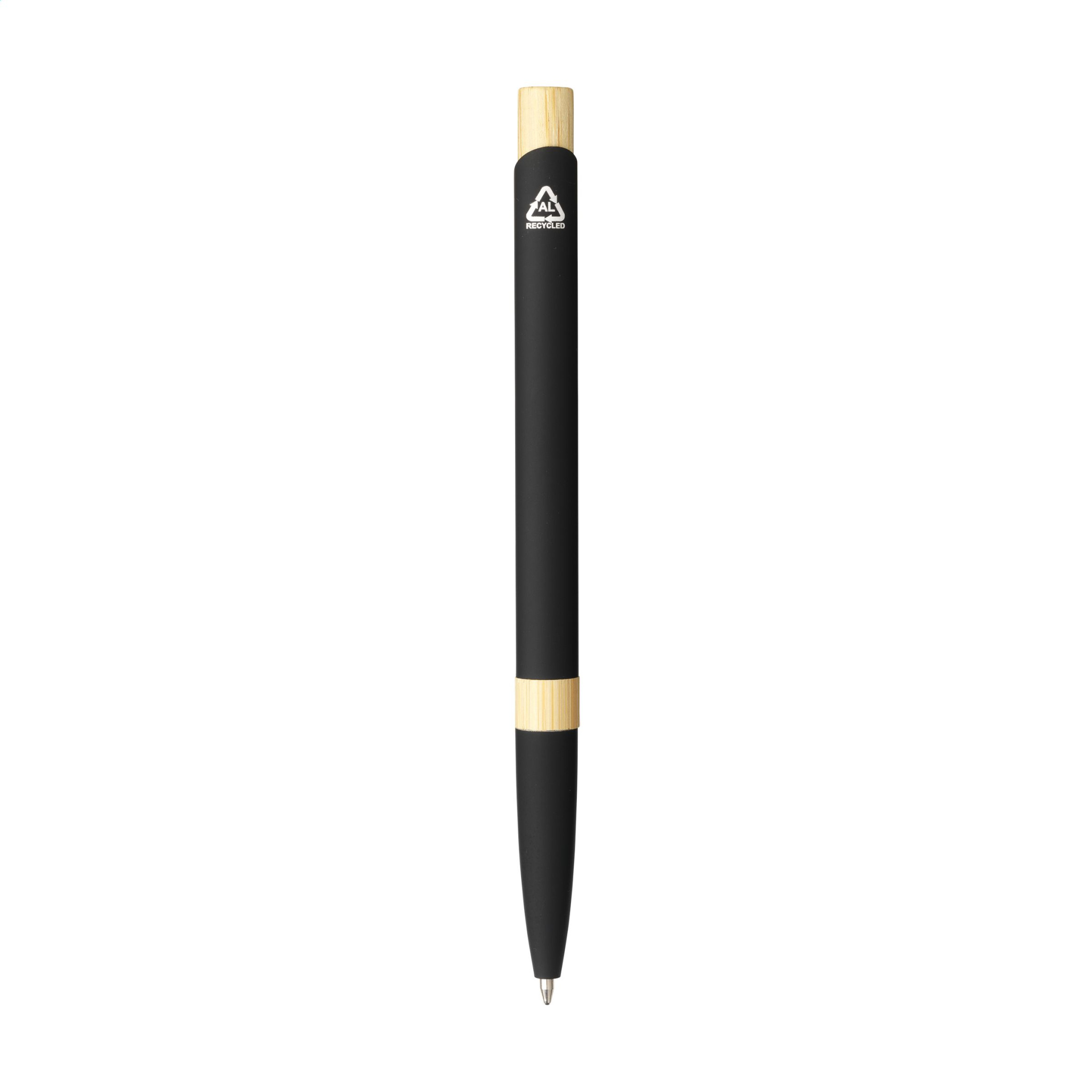 Vau! Sinine tint, õhuke pastapliiats kummeeritud viimistlusega taaskasutatud alumiiniumist silindri ja tugeva metallklambriga. Bambusest koosnevad aktsendid annavad pastakale loomuliku iseloomu. GRS-sertifikaadiga. Kokku taaskasutatud materjal: 73%. Taaskasutatud alumiiniumi kasutamine tähendab, et tootmises kasutatakse vähem uusi tooraineid. See tähendab väiksemat energiatarbimist ja vähem veekasutust. Vastutustundlik valik.