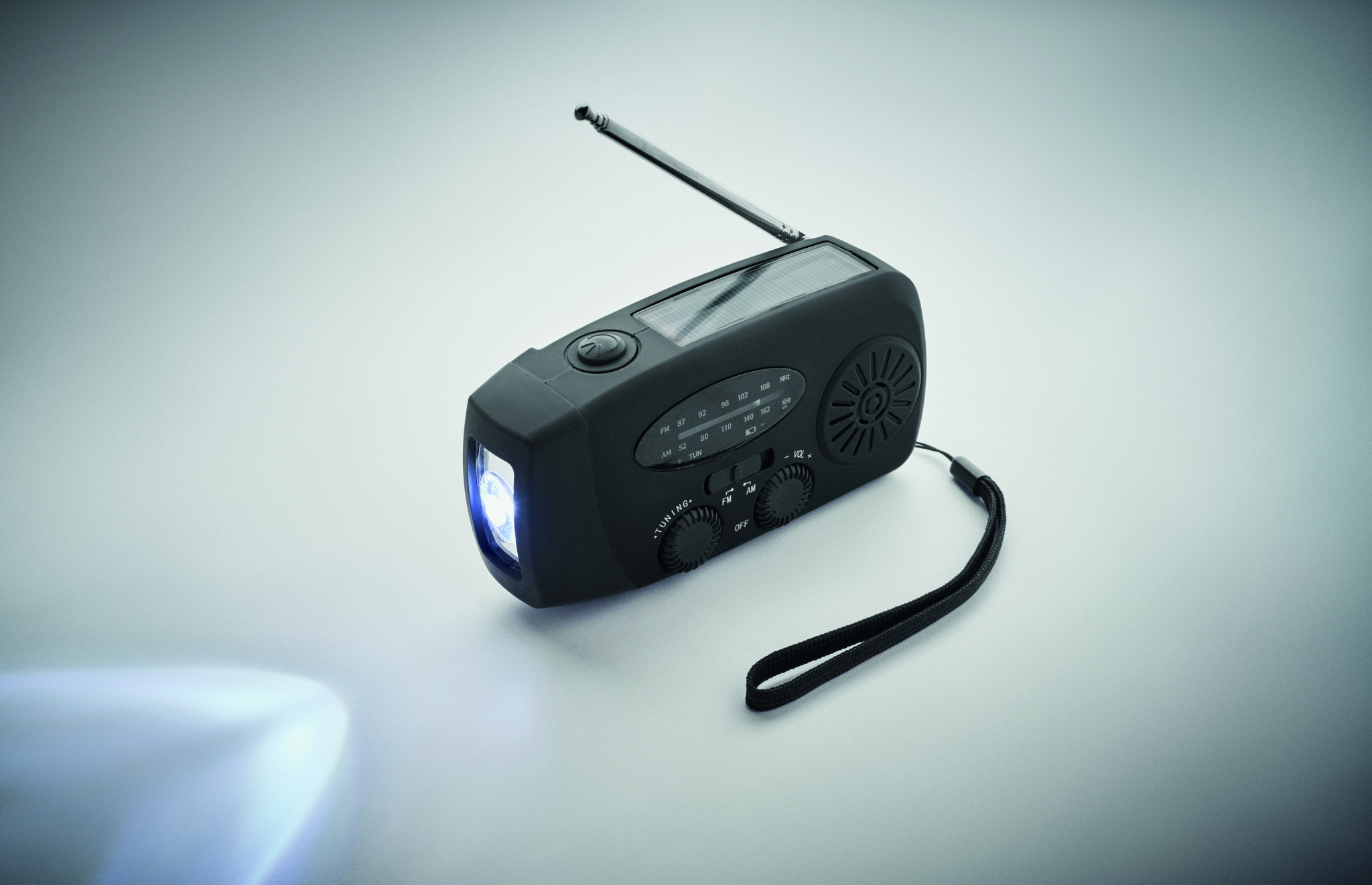 Kaasaskantav AM/FM-raadio vastupidava ABS-plastst korpusega. Raadiol on integreeritud LED-taskulamp (2 valgustusrežiimi) ja 1200 mAh akupank hädaolukordadeks. Seadet saab laadida nii päikesepaneeli kui ka käsivända abil – töötab ka ilma elektrivõrguta.