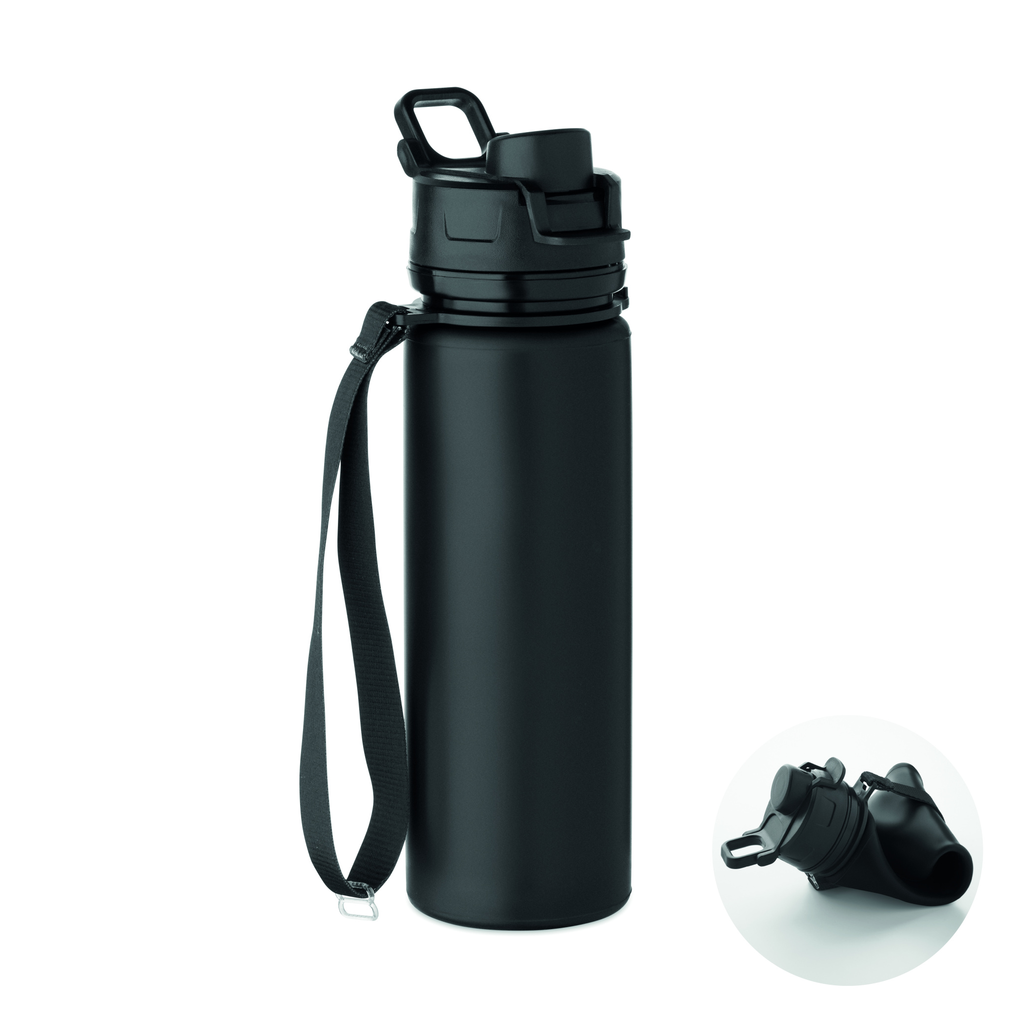 Kokkupandav silikoonist spordipudel PP-kaane, käepideme, polüesterrihma ja läbipaistva pandlaga. Lekkevaba. Maht: 500 ml.