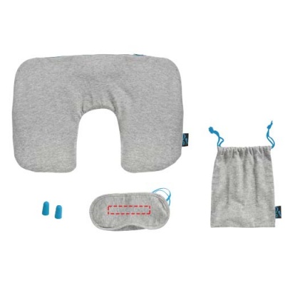 Pehme reisikomplekt sisaldab täispuhutavat helesinise tõmblukuga kaelapatja, erksinise elastsusega silmamaski, erksinisi pehmeid kõrvatroppe ja erksinise nööriga kinnisega pehmet kotti.