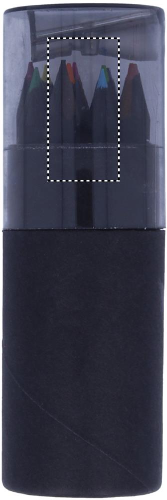 See musta värvi paberist torukarp sisaldab 12 värvipliiatsit ja karbi kaanes pliiatsiteritajat.