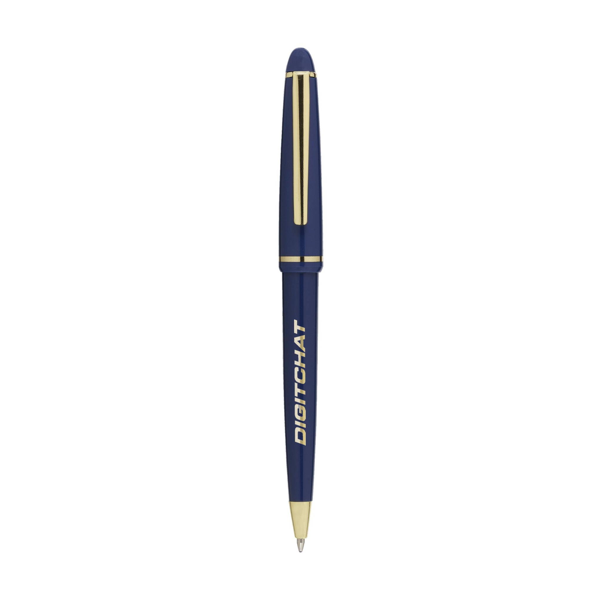 Sinise tindiga pastapliiats poleeritud silindri, kullatud ehitud klambri ning terava ja keeratava otsaga.