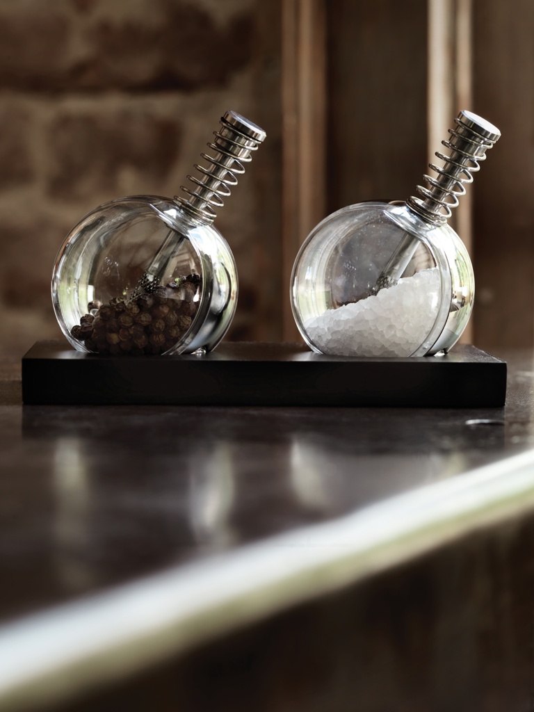 Planet on stiilne pipra- ja soolakomplekt, mille igas jahvatusmasinas on ainulaadne vedrujõuline disain, mis võimaldab mugavat ühe käega kasutamist. Kuna maakerad on läbipaistvad, on meresoola ja pipra taset lihtne näha. Registreeritud disain®