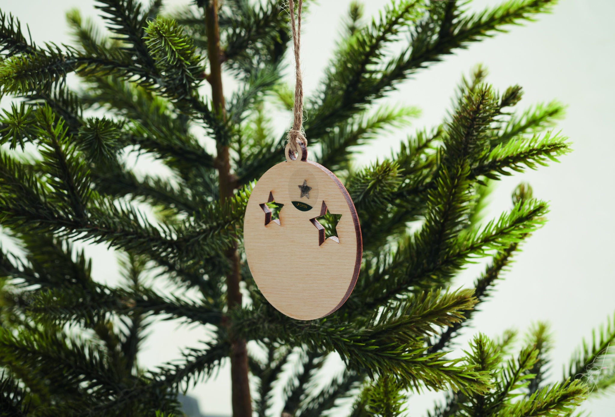 Puidust ümara kujuga dekoratiivne jõulukuul džuudist nööriga, lisatud juurde kuuseseemned. Pakend: kraftpaberist ümbrik. Valmistatud EL-is.