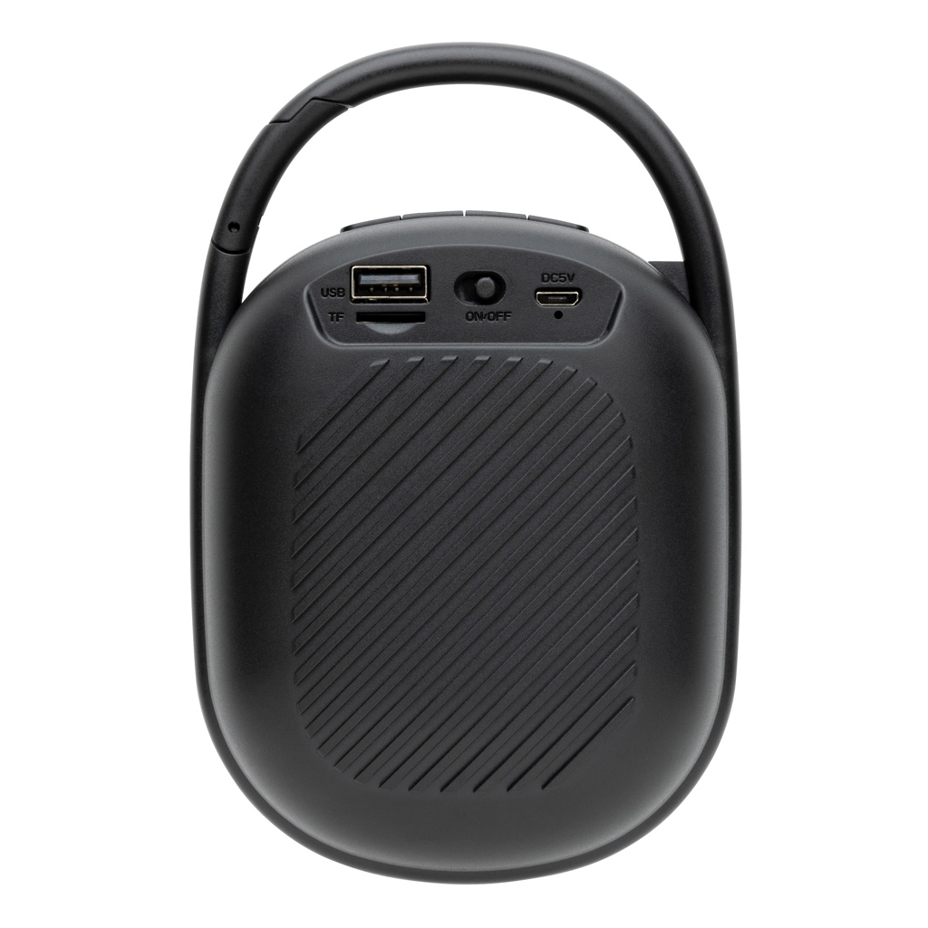 Kaasaskantav, kuid võimas 5W kõlar integreeritud RGB valgusrõngaga. Valmistatud 100% RCS-standardi taaskasutatud ABS-plastist korpusega. Taaskasutatud kogusisaldus: 36% eseme kogukaalust. 1200 mAh liitiumakuga, mis võimaldab mängida kuni 6 tundi. Laadimine toimub 4 tunni jooksul. Integreeritud MIC-iga kõnedele vastamiseks. Integreeritud TF-pesa ja USB-pordiga. Kaasas BT 5.0 sujuvaks tööks kuni 10 meetri kaugusel. Klambriga kõlari kinnitamiseks seljakoti või mõne muu eseme külge. Kaasa arvatud PVC-vaba ringlussevõetud TPE materjalist laadimiskaabel. ; Toode ja tarvikud 100% PVC-vaba. Pakitud FSC segupakendisse.