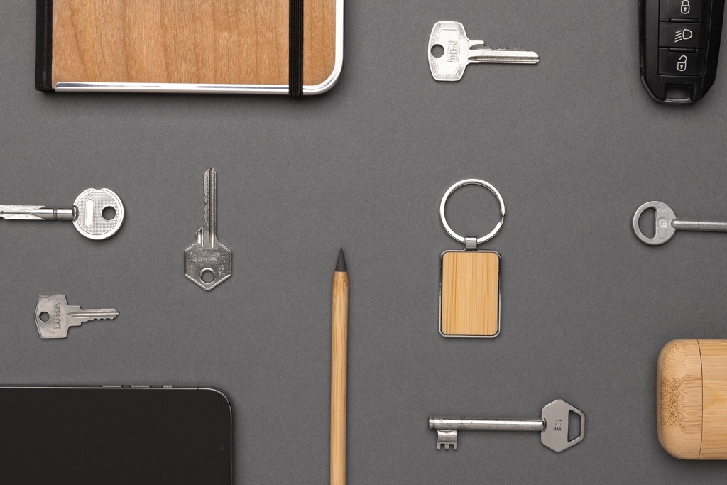 Logotrade firmakingituse foto: RCS taaskasutatud tsingisulamist ristkülikukujuline bambusega võtmehoidja