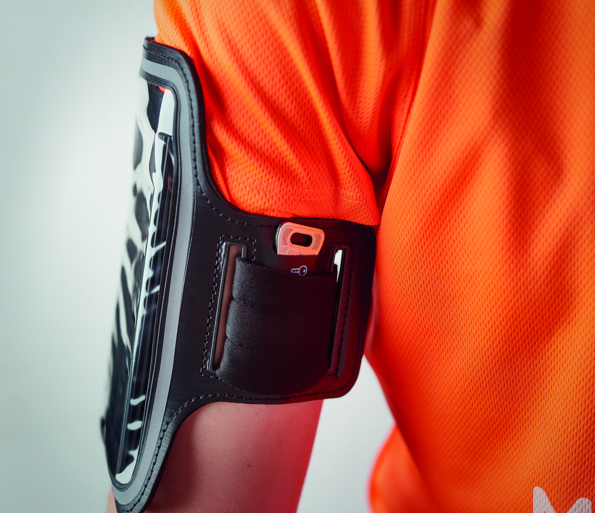 Reguleeritav neopreenist käepael, läbipaistva esiosa ja helkurdetailidega. Sobib kuni 6,5-tollise ekraaniga telefonidele.