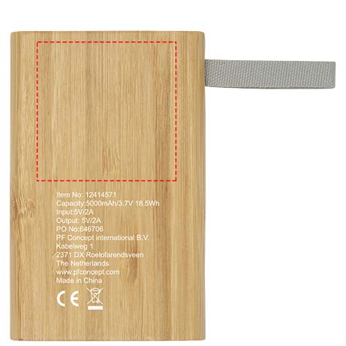 Bambusest toitepank, mis pakub 5000 mAh tagavaratoidet mobiiltelefonidele või teistele digitaalsetele seadmetele. Sellel on LED-indikaatortuled ja RPET-materjalist rihm. Pakitud kinkekarpi ja tarnitakse koos kasutusjuhendiga (mõlemad säästvast materjalist). Kaasas mikro-USB laadimiskaabel. Kuna bambus on looduslik toode, võib iga eseme värvus ja suurus veidi erineda, mis võib mõjutada lõppviimistlust.