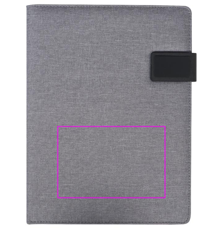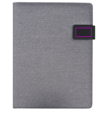 DIN A4 -kansio, jossa on erilaisia lokeroita ja silmukoita, matkapuhelintasku, kirjoitusalusta (20 sivua) ja magneettisuljin. Siirrämme logosi painatuksen etupuolelle.