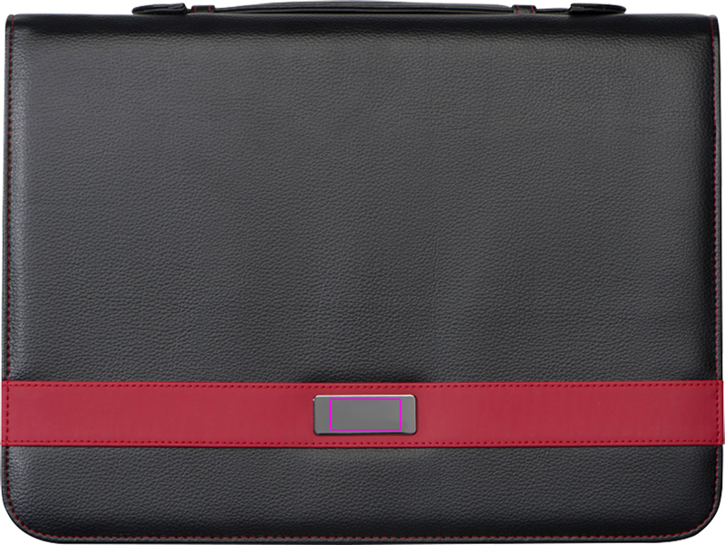 A4-kokoinen kirjoituslaukku, jossa hienointa Bonded Leatheria (nahkakuitukangas), erilaisia kumilenkkejä ja -taskuja, rengaskansio, kirjoitusalusta (60 sivua), tabletin/älypuhelimen pidike, matkapuhelintasku, kantokahva ja vetoketjukiinnitys. Logosi laserkaiverretaan metallilevyn ulkopuolelle.