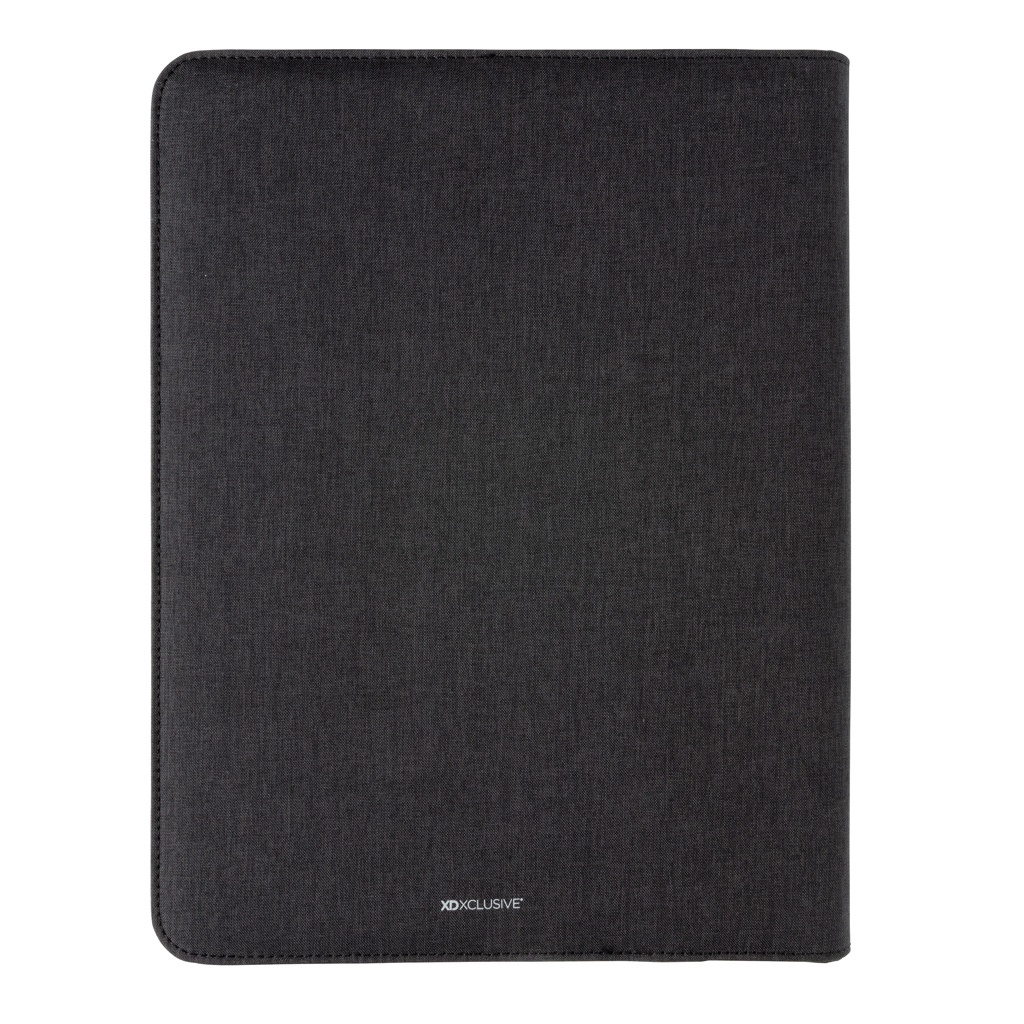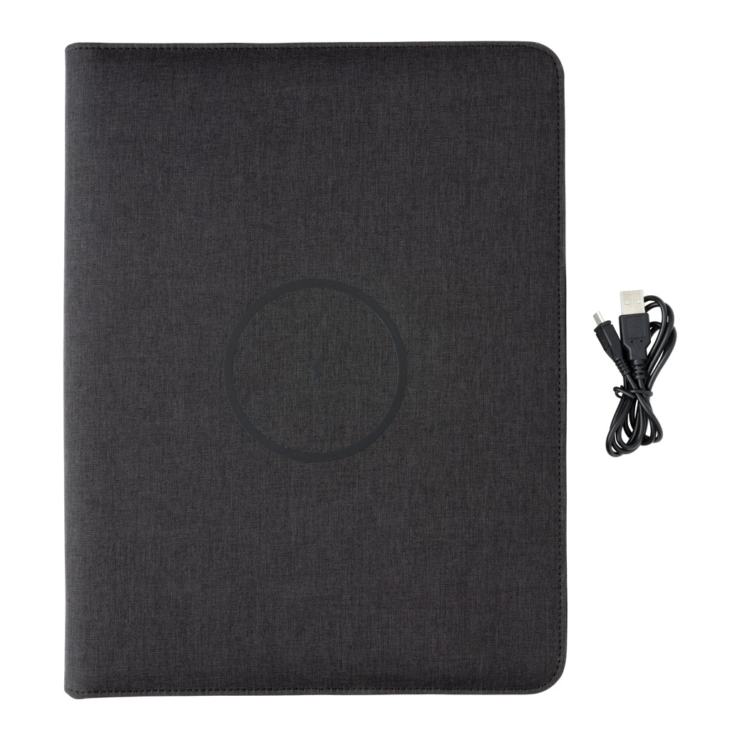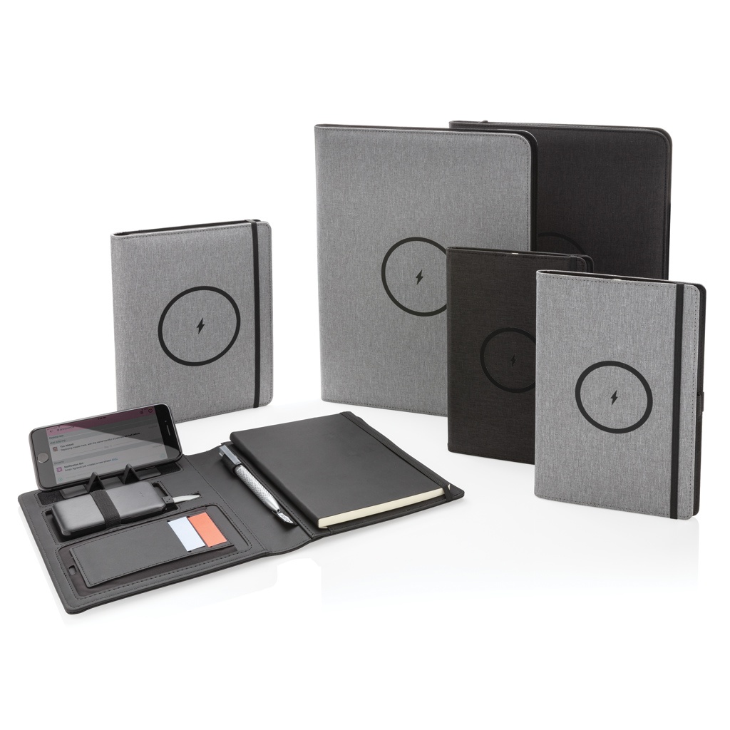 Tämä A4 portfolio, jossa on 20 kermanväristä viivoitettua 70 gramman paperiarkkia muistiona, edustaa uusinta tekniikkaa. Etukannessa on langaton latausalusta puhelintasi varten. (Androidin uusimmat sukupolvet, iPhone 8 ja uudemmat.) Vanhemmat puhelimet ja tabletit voidaan ladata USB-liitäntöjen kautta 5 000 mAh varavirtalähteen avulla. Sisääntulo: 5,0 V/2,1 A. Ulostulo 1: 5,0 V/2,1 A. Ulostulo 2: 5,0 V/2,1 A. Langaton ulostulo: 5W. Rekisteröity malli®