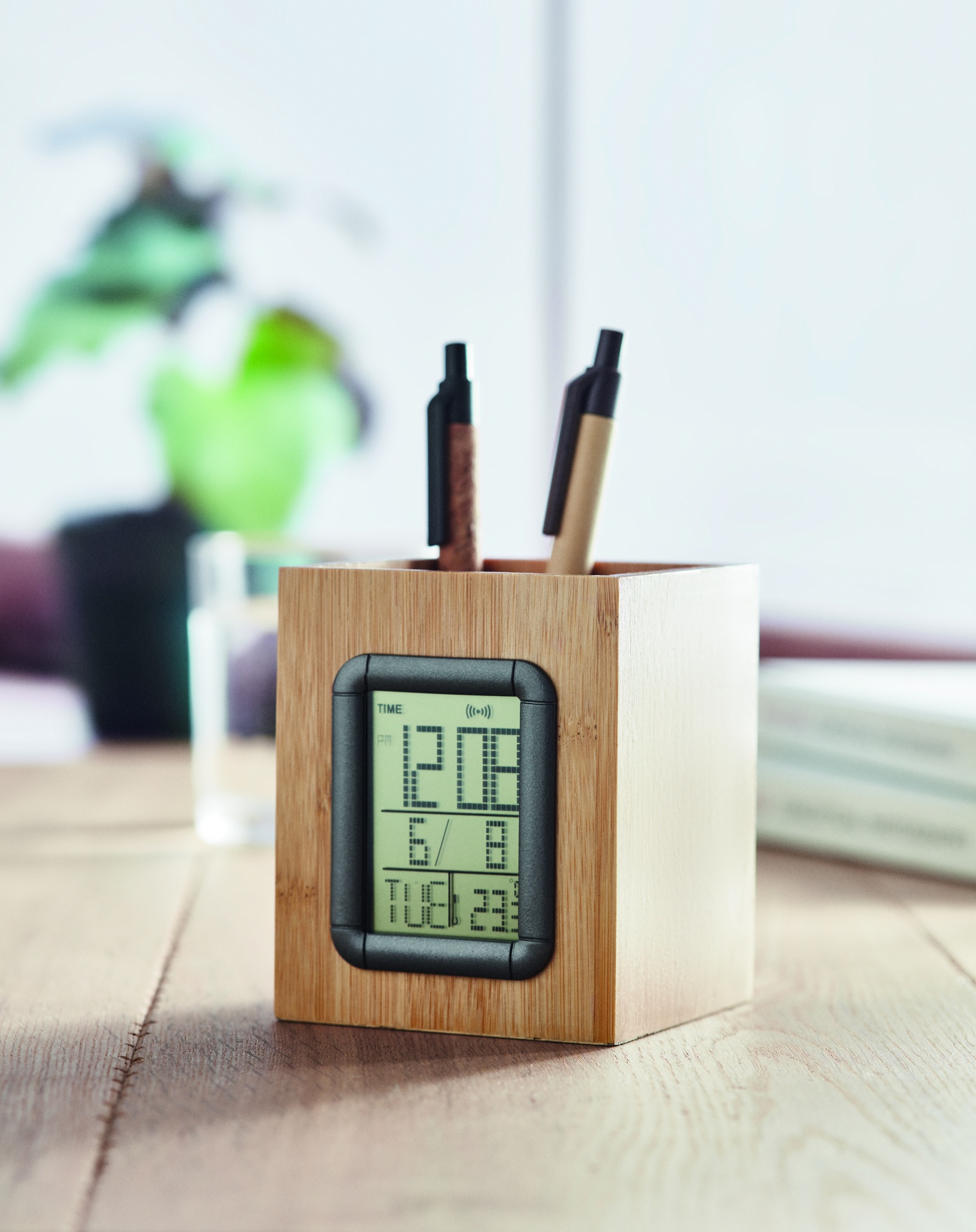 Bambu kynäteline ja näyttö, näytössä kalenteri, herätyskello ja lämpötilamittari. Sisältää 2 nappipatteria. Luonnollisen materiaalin (bambu) vuoksi, tuotteiden värissä/ koossa saattaa olla erinäisyyksiä ja tämä voi vaikuttaa painatuksen lopputulokseen.