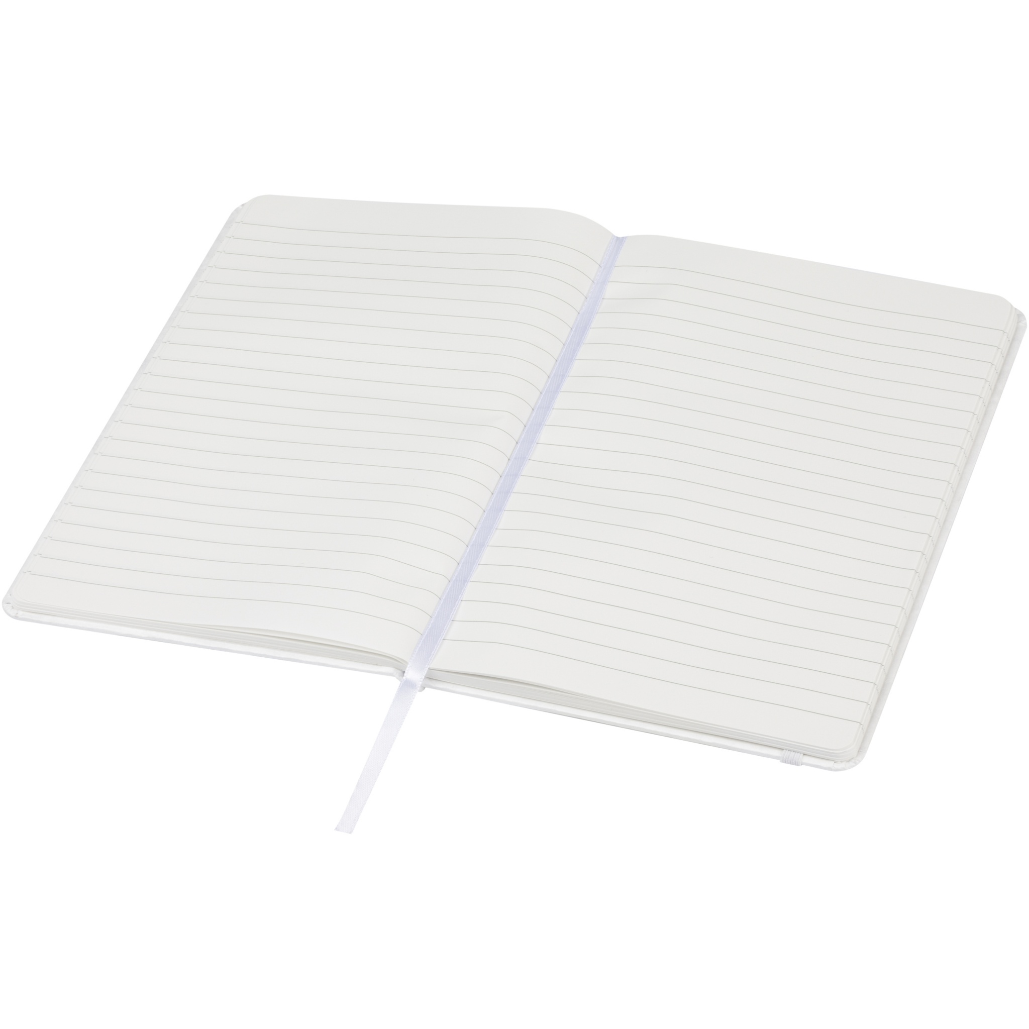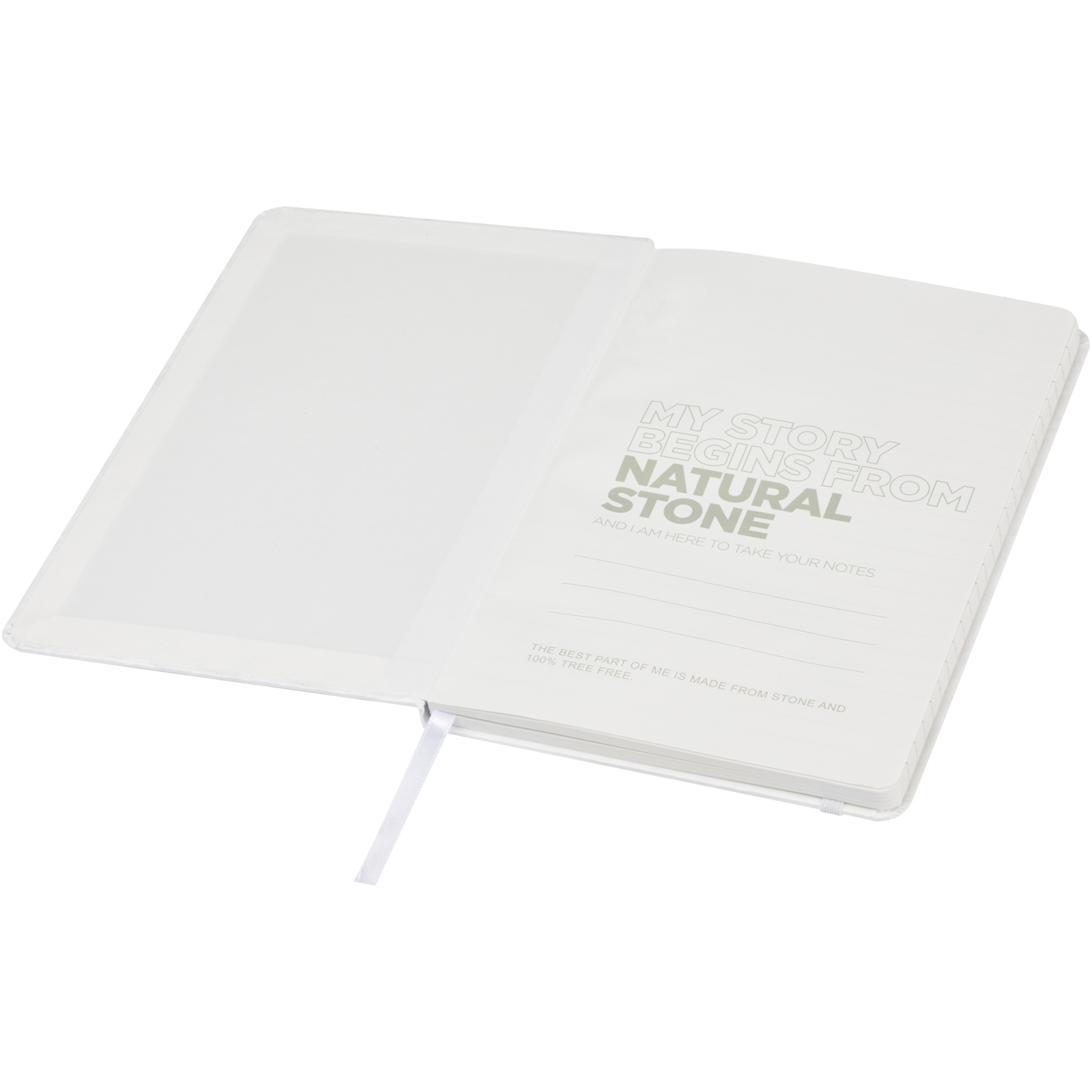 A5-kokoinen repeämätön muistikirja, jonka sisäsivut on valmistettu kivestä. Kivipaperi on 100-prosenttisesti puutonta, ja tuotantoprosessissa käytetään vähemmän energiaa verrattuna kierrätettyyn tai uuteen sellupaperiin. Se on vedenkestävä, joten kaatuneet nesteet on helppo pyyhkiä pois. Siinä on väriä vastaava nauhamerkki, kuminauha sekä 60 arkkia, 120 g/m², viivakivipaperia. Pakattu kartonkisuojukseen.
