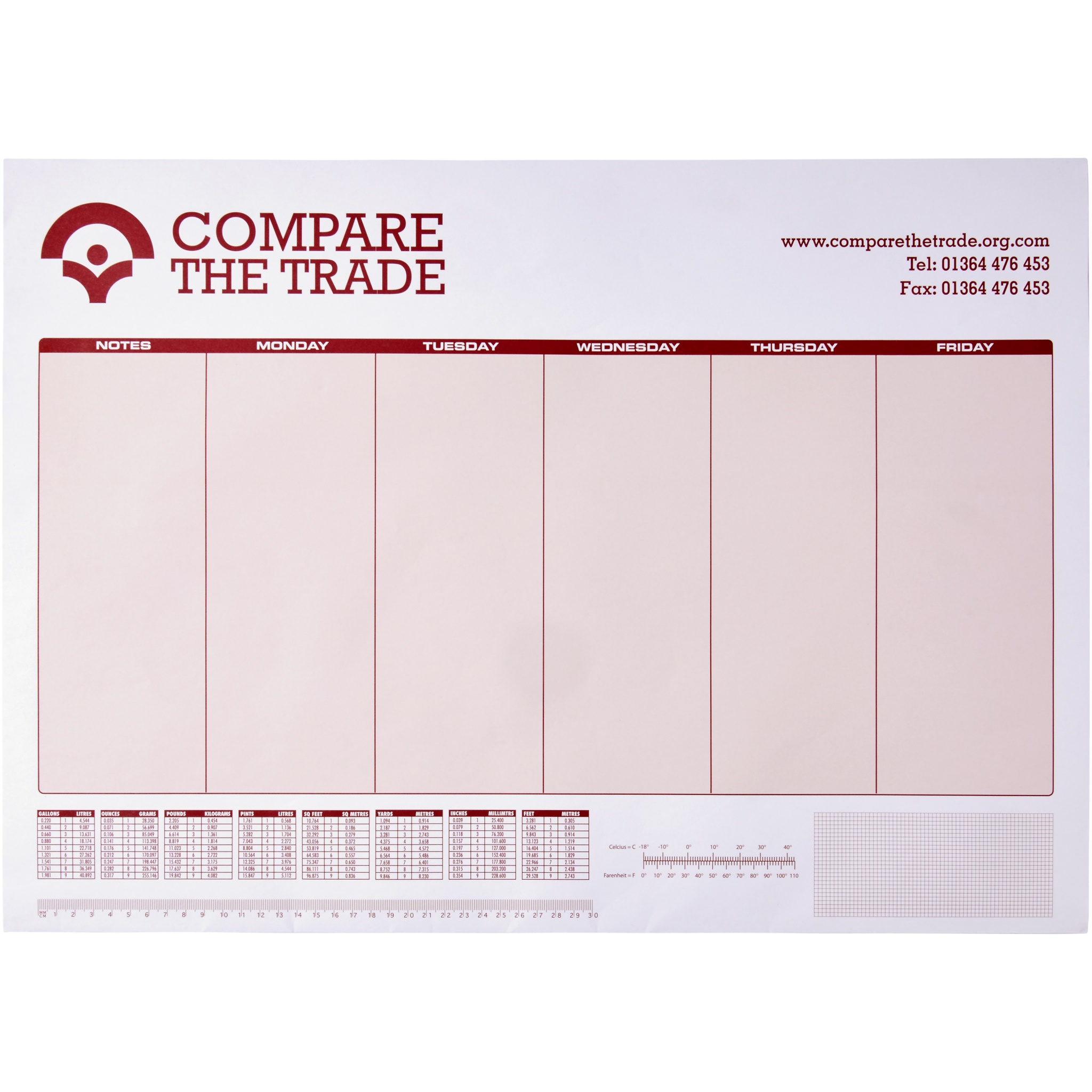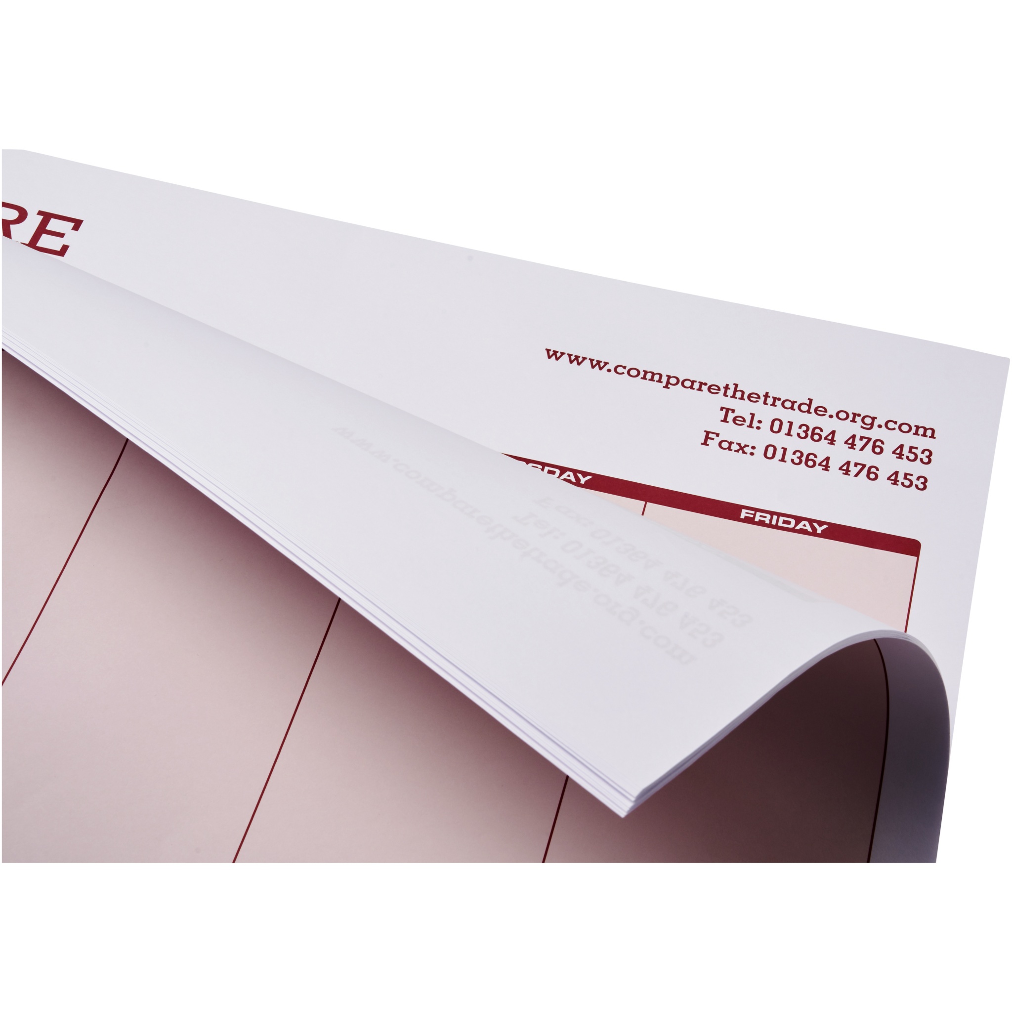 Valkoinen A3 Desk-Mate®-muistio. Sisältää 50 kpl tyhjiä paperiarkkeja, 80 g/m2. Täysivärinen painatus mahdollista kaikille arkeille. Saatavilla kolme kokoa: 25 arkkia, 50 arkkia ja 100 arkkia.