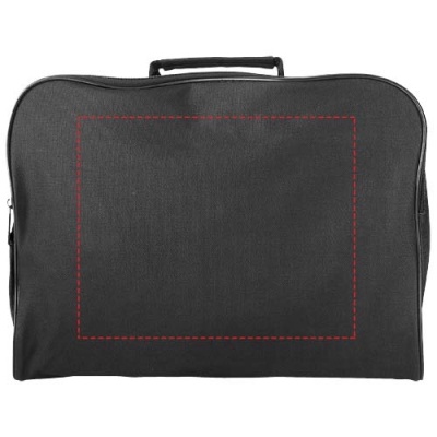 Neliönmuotoinen kokouslaukku, jossa on vetoketjullinen säilytystasku. A4-asiakirjoille.