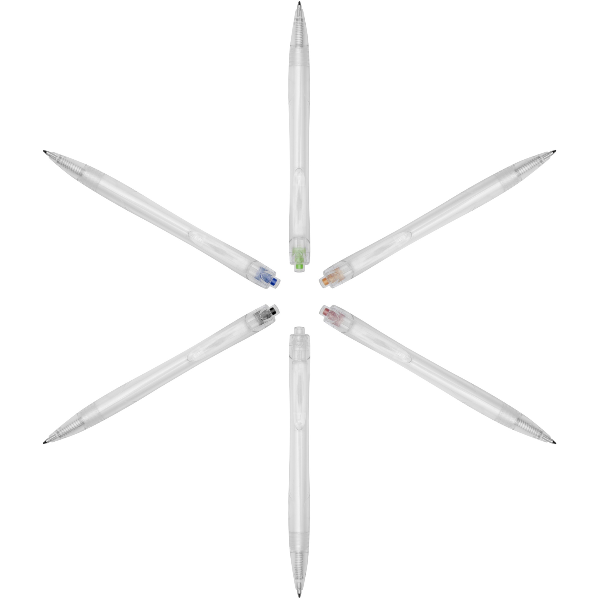 Neitsytmuovin käyttöä vähentävästä kierrätetystä RPET-muovista valmistettu napsautettava kuulakärkikynä. Kuulakärkikynässä on läpinäkyvä runko ja värillinen painike. Sininen muste, voidaan yhdistää 107763 Honua RPET -muistion kanssa.