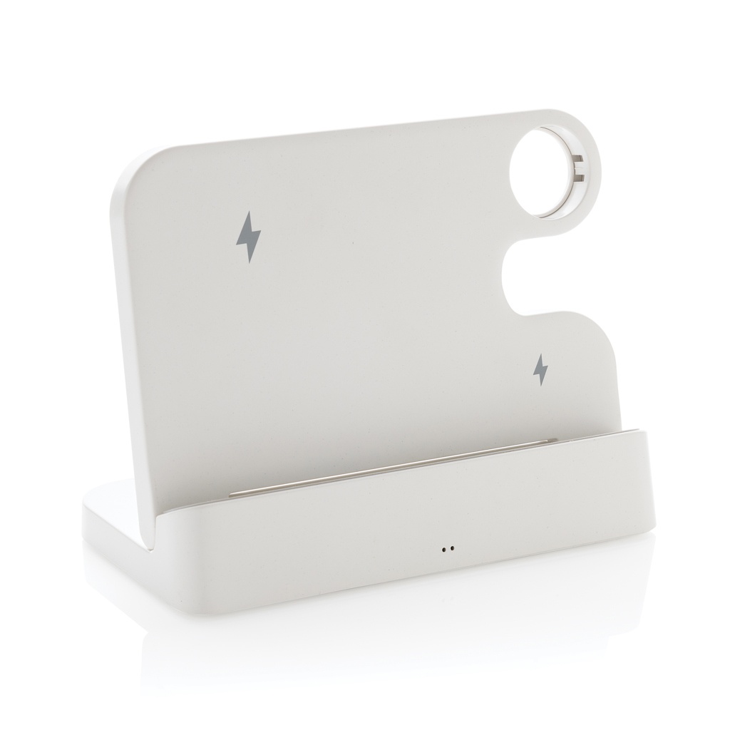 Taitettava design-latausteline 15 W:n langattomalla laturilla, joka on valmistettu kierrätetystä ABS:stä. Toisella 5 W:n langattomalla laturilla onnistuu pienempien esineiden, kuten kuulokkeiden, lataaminen. Mukana iWatch-paikka, joka sopii iWatchin viralliseen latauskaapeliin. Takapuolella on 5V/1A USB A- ja USB-C -lähtöportti tuotteiden lataamiseen kaapelilla. Pohjassa on silikonikärjet liukumisen estämiseksi ja silikonipehmuste jalustassa, jotta puhelin pysyy hyvässä kunnossa. Kierrätetty kokonaissisältö: 80 % tuotteen kokonaispainosta. RCS-sertifiointi varmistaa kierrätysmateriaalien täysin sertifioidun toimitusketjun. Pakattu FSC® pakkaukseen. PVC-vapaa. Sisältää 120 cm:n USB-A:sta USB-C:hen latauskaapelin, joka on valmistettu RCS TPE kierrätetystä materiaalista. Pakattu FSC® pakkaukseen. PVC-vapaa