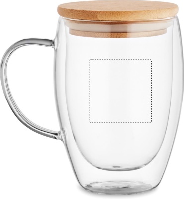 Kaksiseinäinen borosilikaattilasimuki kahvalla ja bambukannella. Tilavuus: 300 ml.