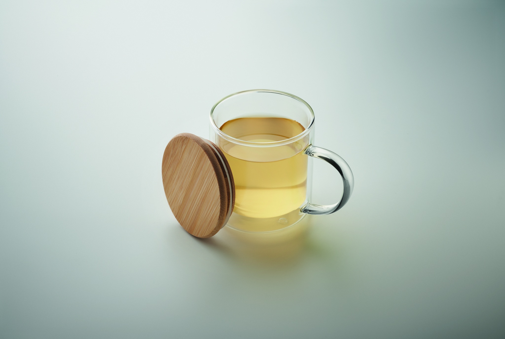 Kaksiseinäinen borosilikaattilasimuki bambukannella ja värillisillä kahvoilla. Tilavuus: 300 ml.