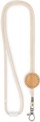 Puuvillakaulanauha jossa on pyöreä bambukiristin, papukaijalukko ja niskassa turvalukko. Pituus 50 cm.