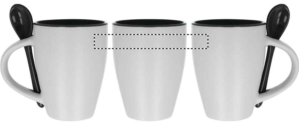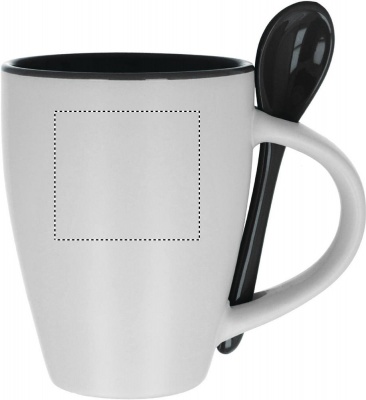 Kaksivärinen keraaminen kahvimuki 250 ml, sisältää lusikan. Tampopainatus kestää vain käsinpesun, keraaminen painatus on konepesun kestävä. Mikroaaltouunin kestävä, yksittäispakattuna 11,5x10,5x9,3cm laatikkoon.