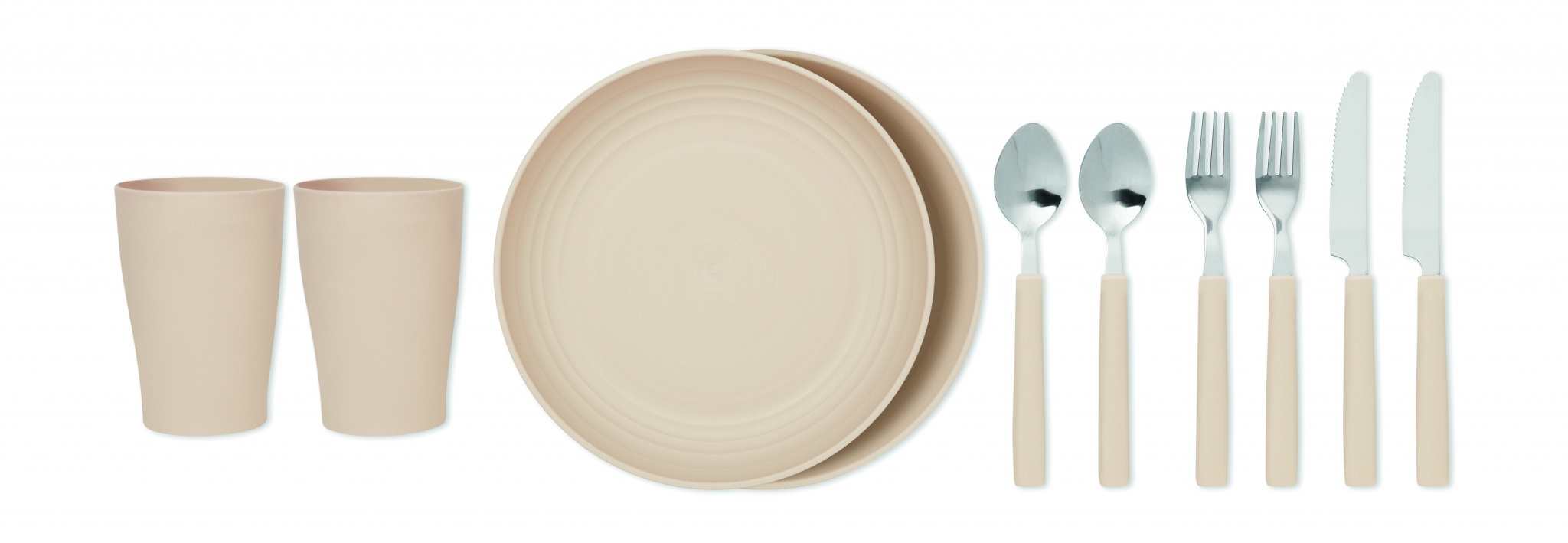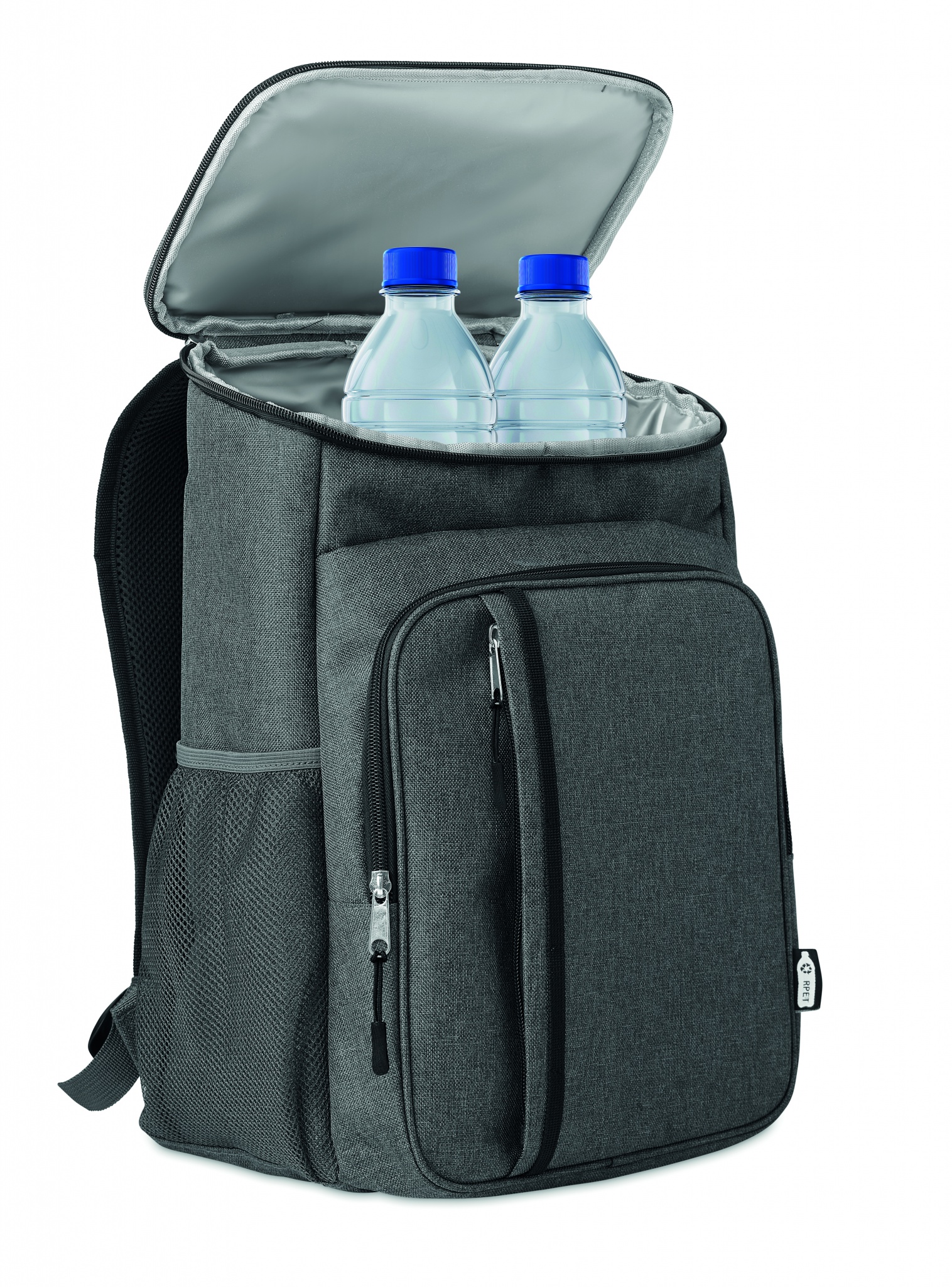 600D RPET- kylmälaukku-/ piknikreppu, sisältää 2 hengen ruokailutarvikkeet. Ruostumattomasta teräksestä valmistettu veitsi, PP- haarukan, lusikka ja kupin.