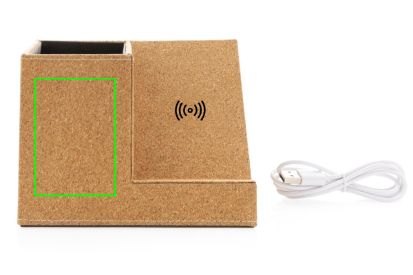 5W langaton laturi kynäpidikkeellä, valmistettu luonnonkorkista. 150cm vehnänolkea (15%) vehnänolkea sekoitettuna micro TPE kaapeliin. Sopii yhteen kaikkien QI-sopivien laitteiden, kuten uusimpien Android- ja iPhone puhelimien, kanssa. Tuotteen takapuolella on kaksi USB A ulostuloliitintä langallista latausta varten. Sisääntulo: 5V/2A, langaton ulostulo: 5/1A - 5W. 2x USB ulostulo 5V/2A; Tuote ja lisätarvikkeet 100% PVC-vapaita.
