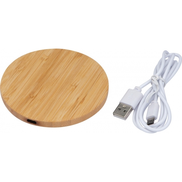 Pyöreä bambusta valmistettu langaton laturi latauskaapelilla, sopii kaikille QI-yhteensopiville älypuhelimille. Asetamme logosi laturiin.