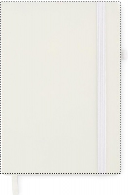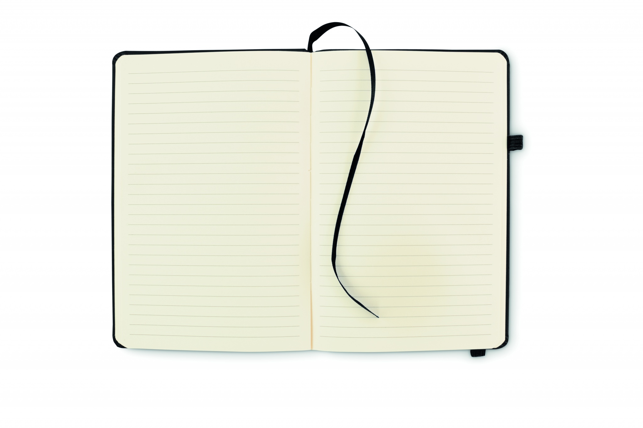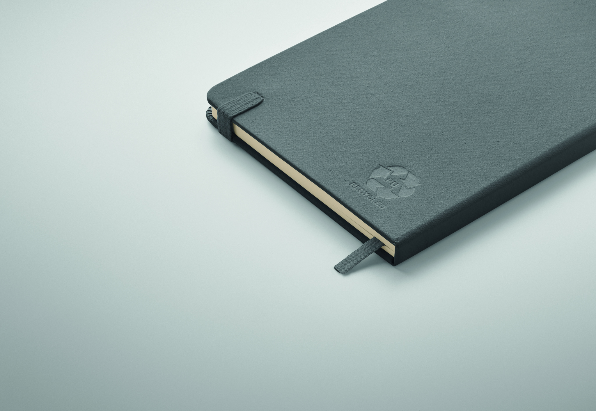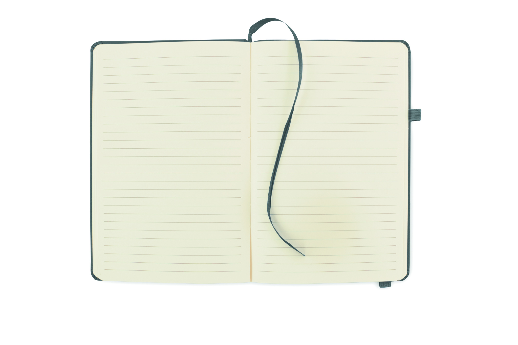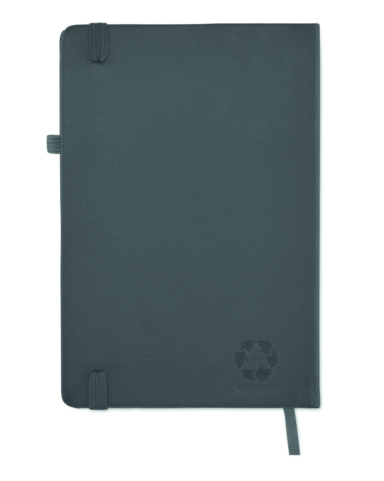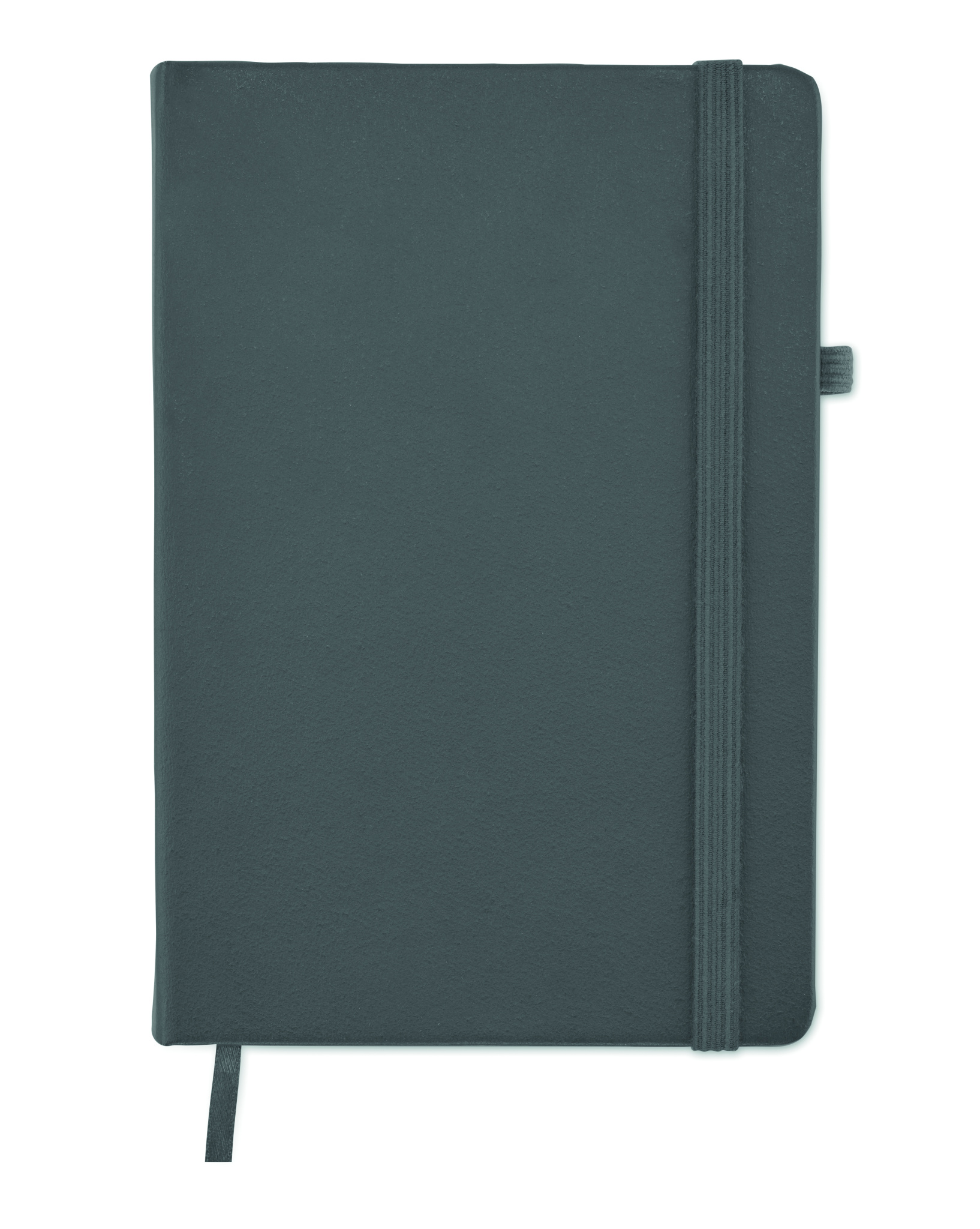 A5 muistikirja jonka kannet on kierrätettyä PU materiaalia. 192 viivoitettua sivua kierrätyspaperista (96 arkkia). Kiinnitys kuminauhalla, kirjanmerkki ja kynäpidike kuminauhasta.