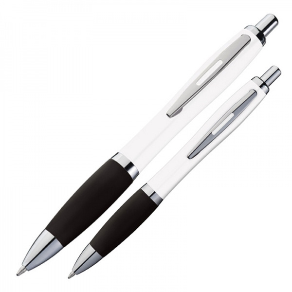 Kuulakärkikynä, jossa valkoinen piippu, metallipidike, sininen kirjoitus iso täyttö ja värillinen pehmeä kosketuskahva. Painamme logosi leikkeen oikealle puolelle.