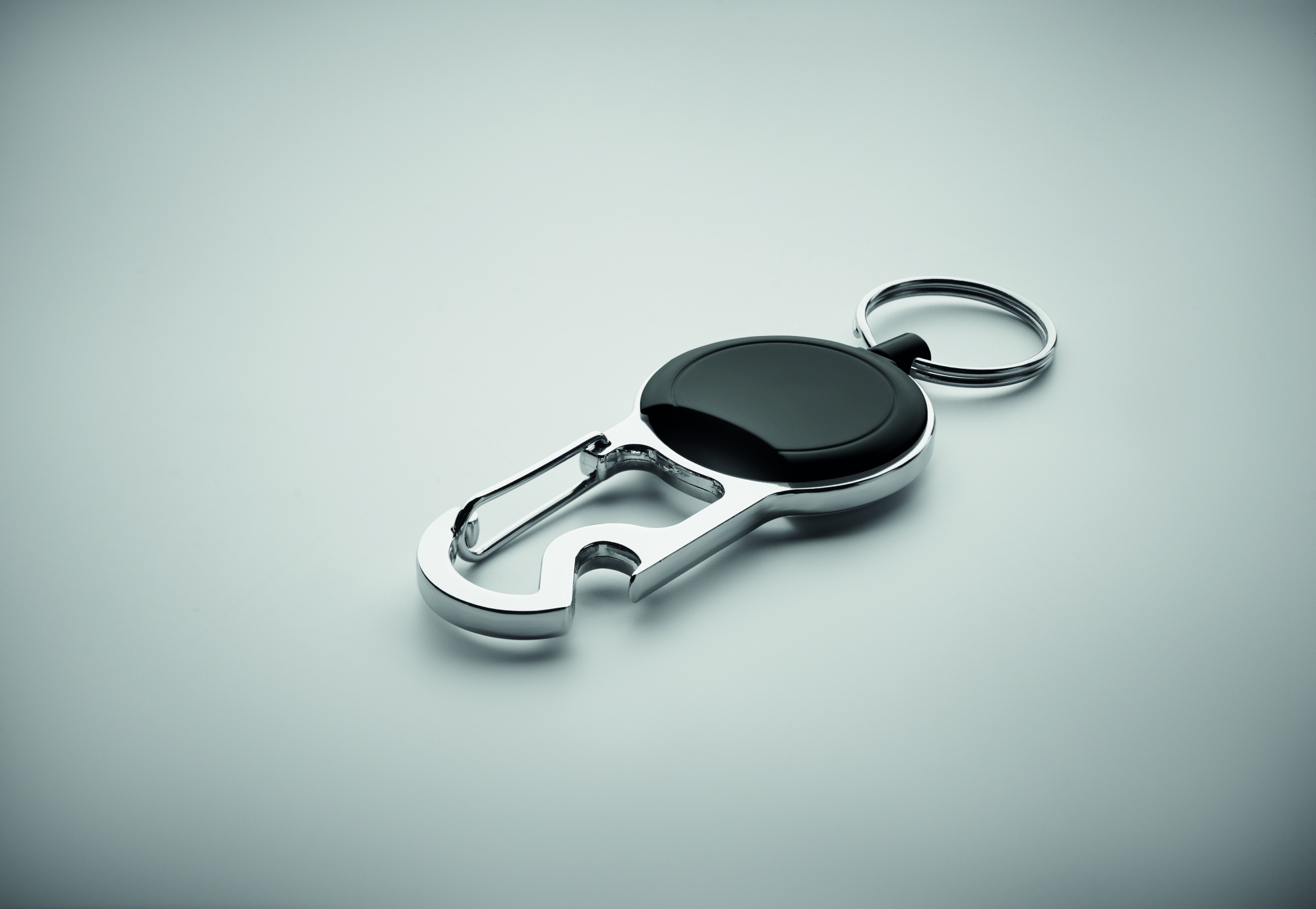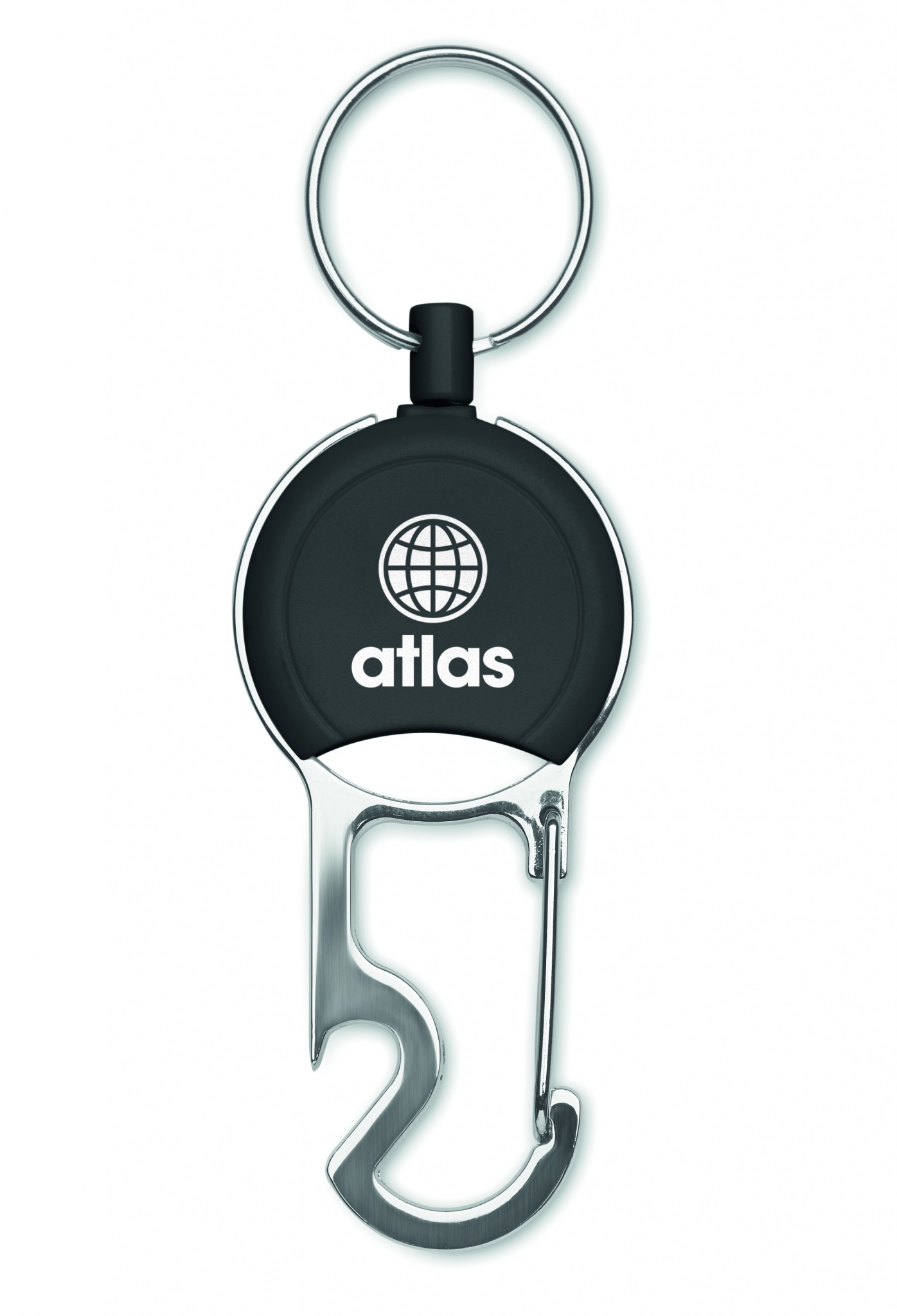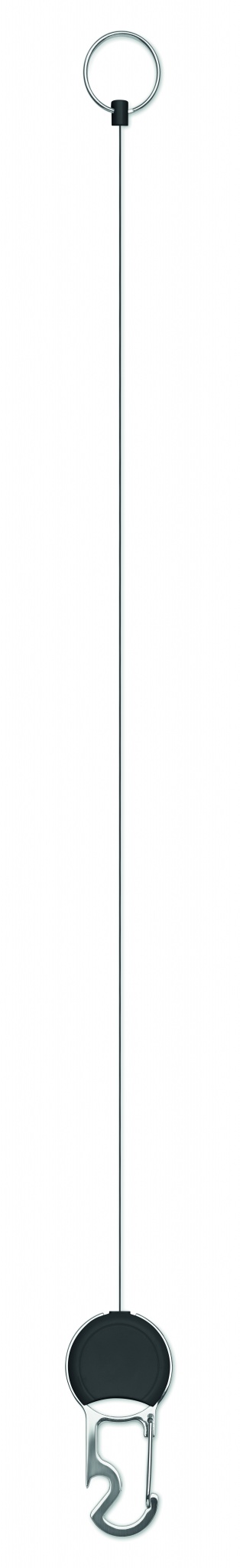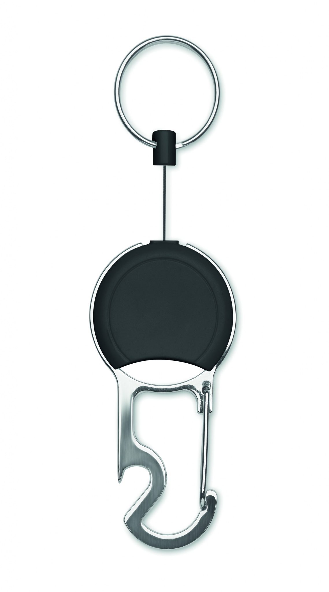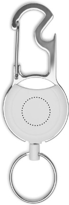 ABS-materiaalista valmistettu sisäänvedettävä nimikortin idike, jossa on klipsi, avainrengas ja pullonavaaja.